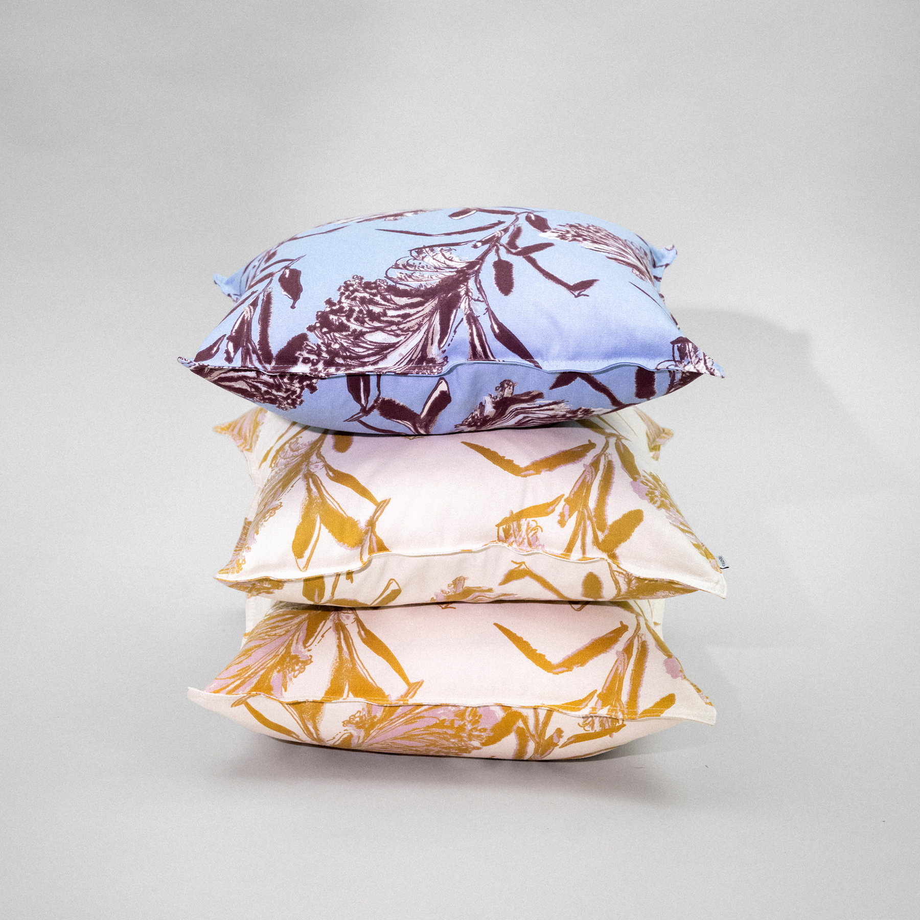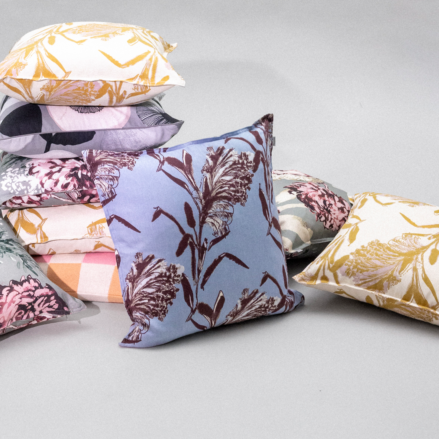 Kun syksyinen merituuli vihmoo sadetta kasvoille, rannan ruo´ot kumartuvat kyyryyn aivan kuten me ihmiset. Jääriitteen keskeltä kurottuvat hennot tähkäpäät saivat suunnittelija Minna Niskakankaan tarttumaan siveltimeen. Märälle paperille levinnyt muste loi ruo´oille pakkashuurteisen ilmeen. Ulkoa syyssateesta on mukava palata kodin lämpöön. Sukeltaa sohvalle Ruoko-tyynyjen keskelle ja tarttua hyvään kirjaan. Ruoko-mallistoon kuuluu tyynynpäällisten lisäksi kodintekstiilejä, kuten kaitaliinoja, torkkupeittoja ja vuodevaatteita.