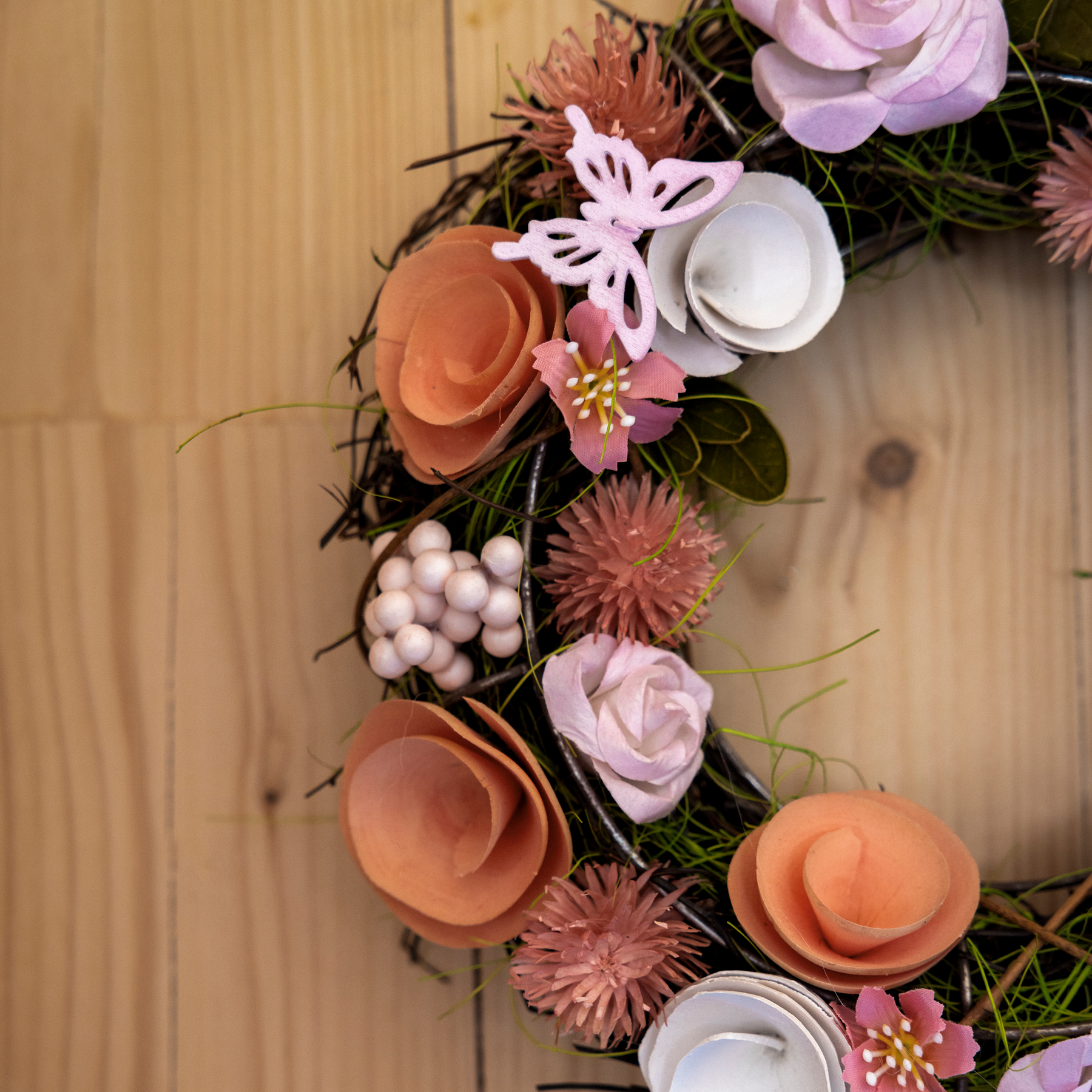 Sammalmaisen pohjan päälle asetellut lohenpunaiset kukat, perhoset ja marjat tekevät Ruusuinen-kranssista raikkaan keväisen näköisen. Kranssin voi ripustaa seinälle tai oveen ilahduttavaksi yksityiskohdaksi. Kranssin halkaisija on 35 cm.