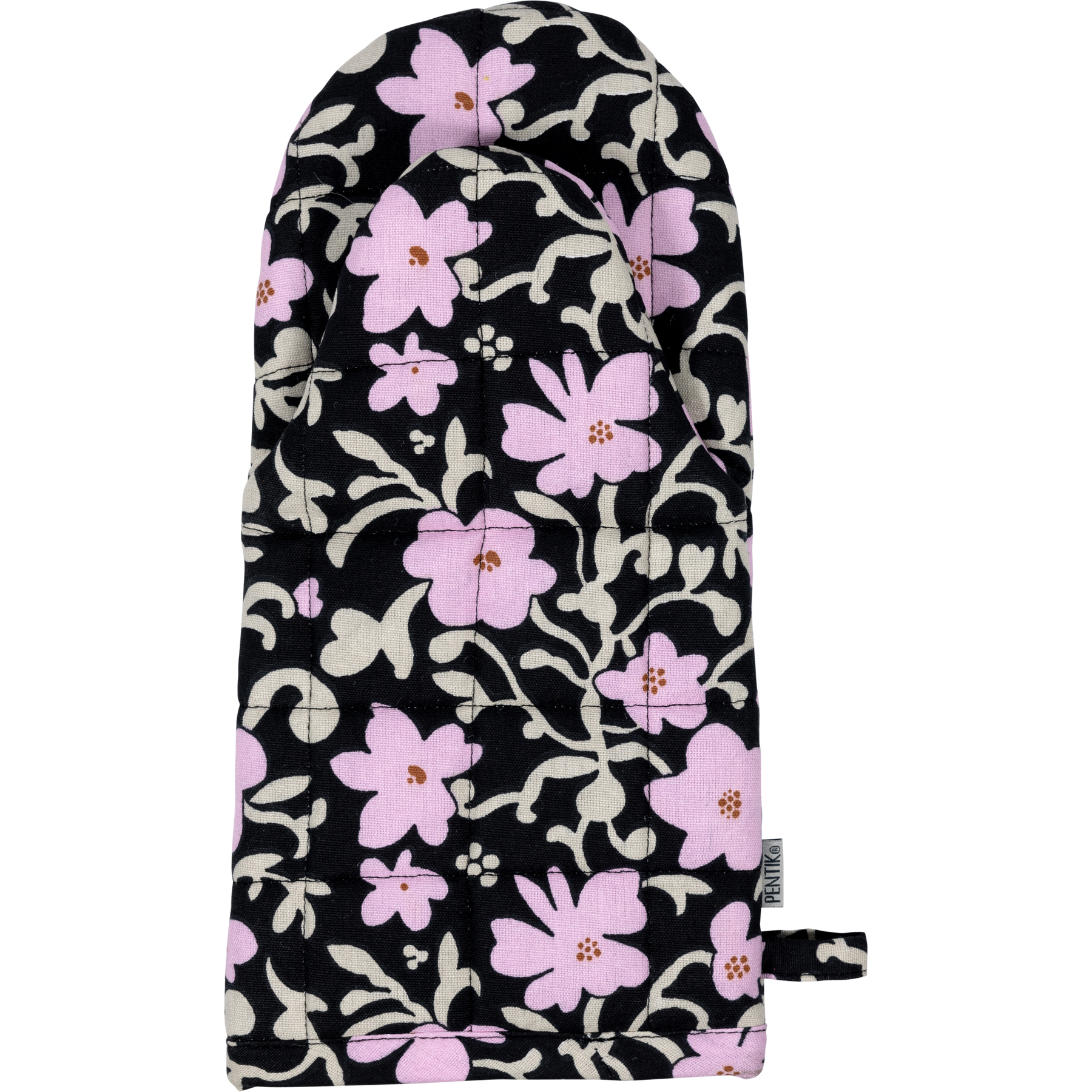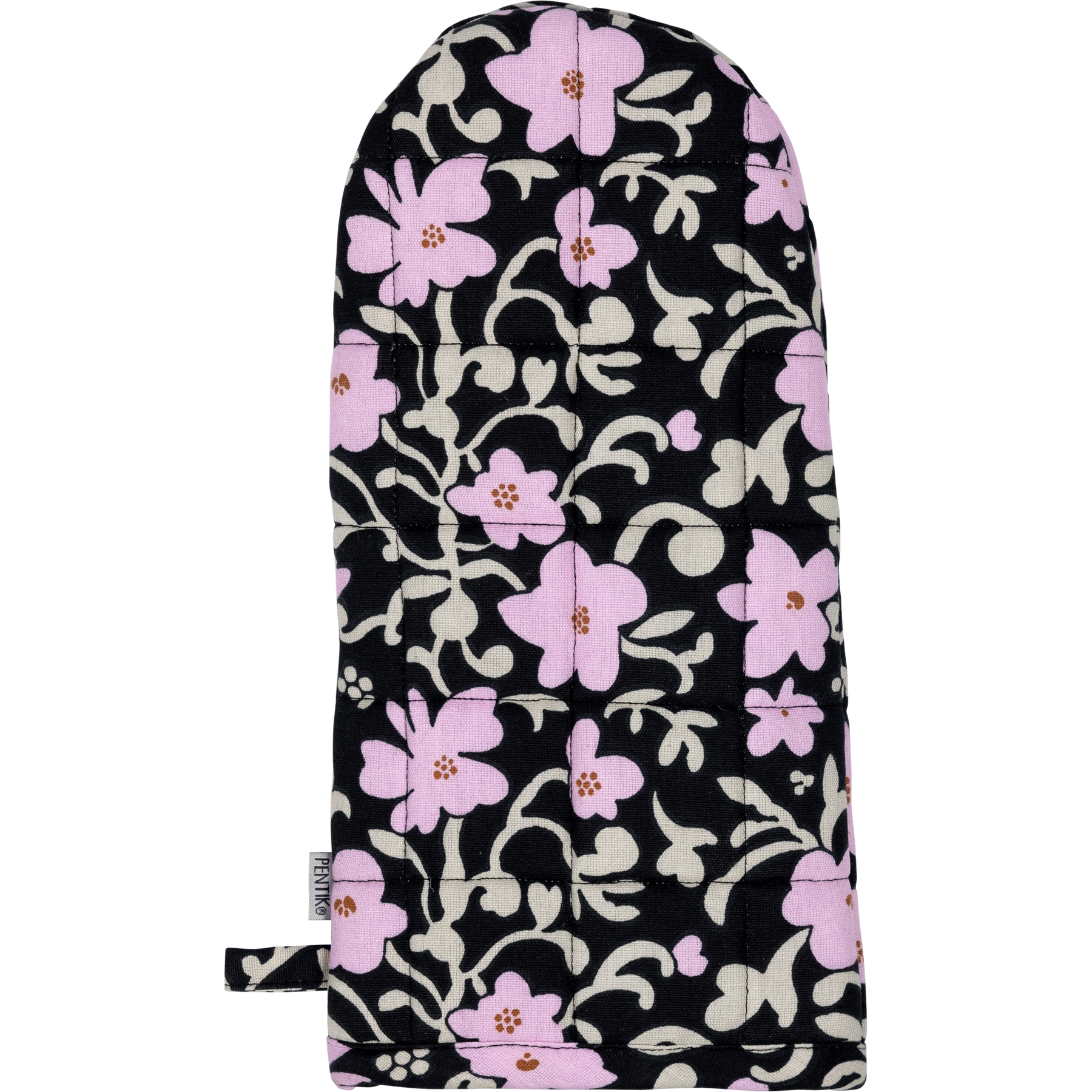 Ruusumalva-malliston vaaleanpuna-musta patakinnas on kooltaan 16x31 cm. Patakintaan voi pestä koneessa 60 asteessa. Varo uunin vastuksia ja avotulta. Tuote on tarkoitettu kuumien astioiden käsittelyyn.