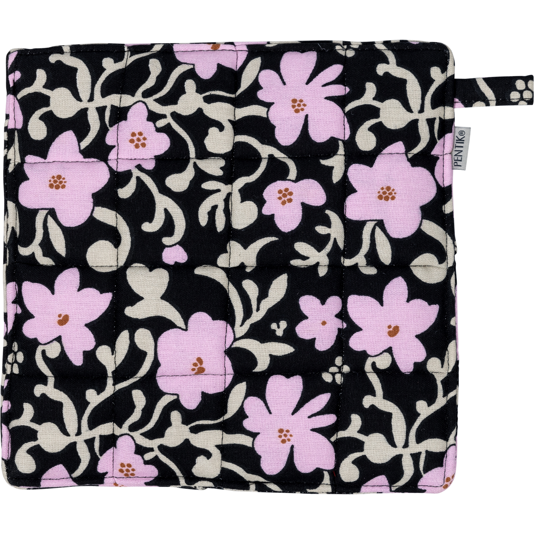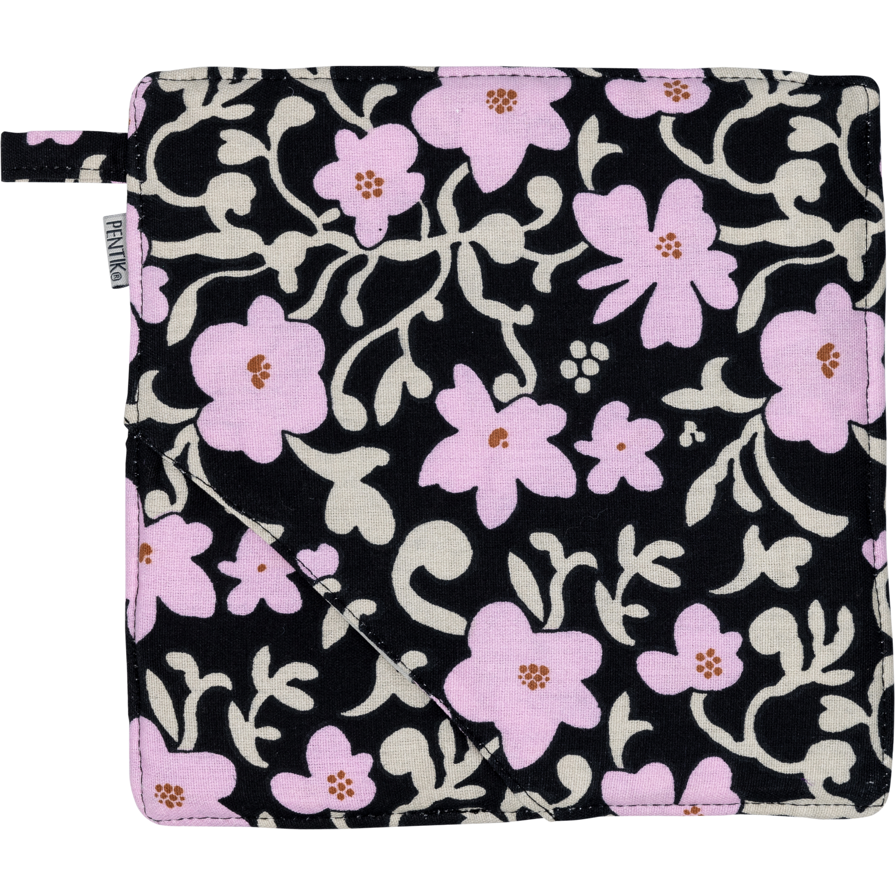 Ruusumalva-malliston vaaleanpuna-musta patalappu on kooltaan 21x21 cm. Patalapun voi pestä koneessa 60 asteessa. Varo uunin vastuksia ja avotulta. Tuote on tarkoitettu kuumien astioiden käsittelyyn.