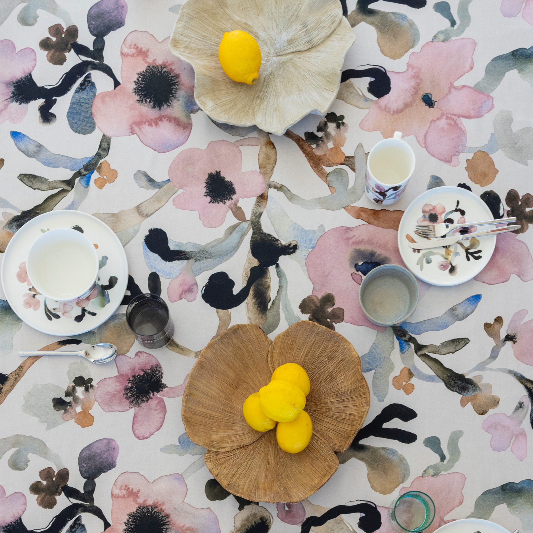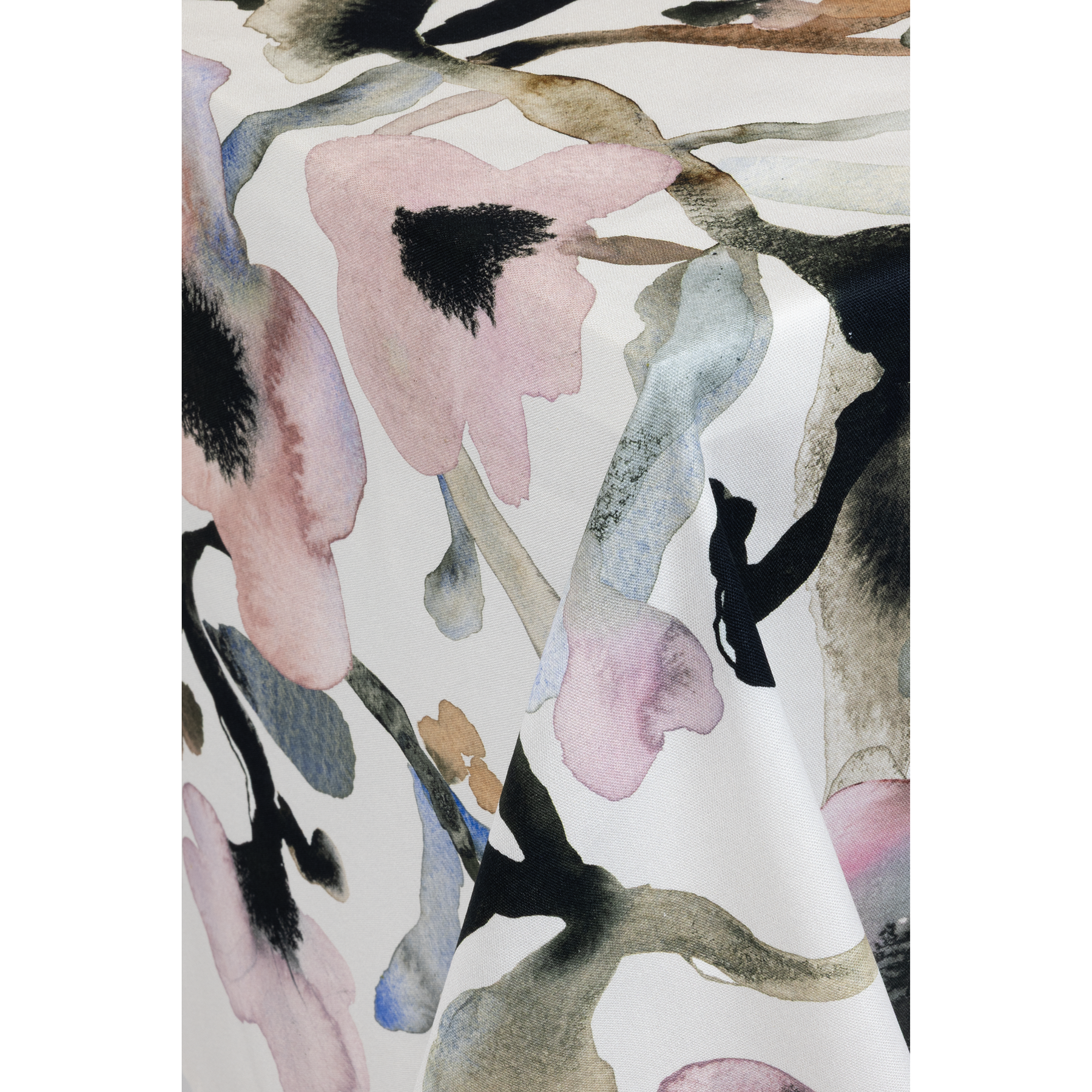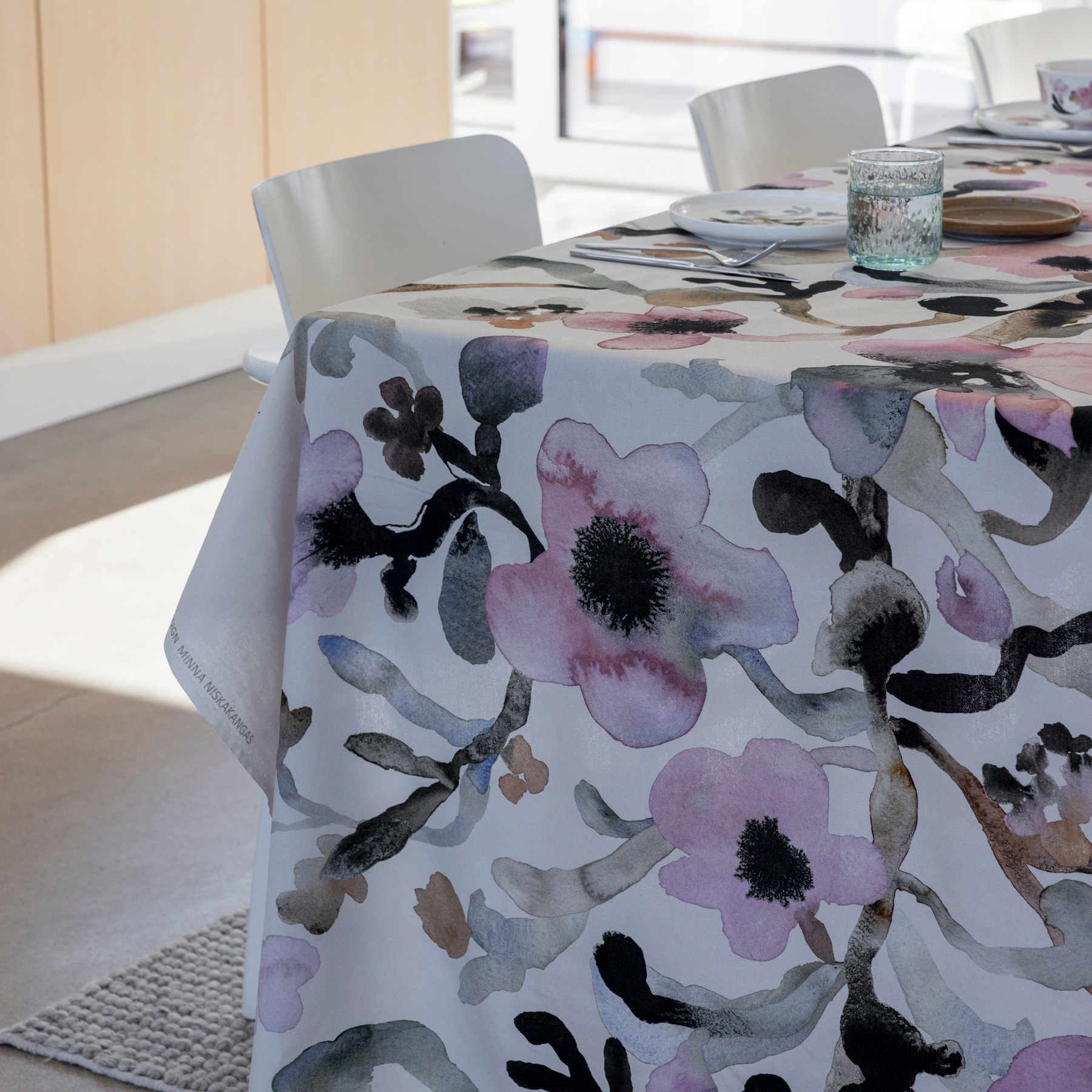 Alkuvuoden uneliaassa hämärässä on tunnelmaa. Kun luonto nukkuu, pakkanen maalaa pastellisia värejä taivaalle. Myös Minna Niskakangas on ottanut jälleen väripalettinsa esiin ja sekoittanut herkkään vaaleanpunaiseen kaamoksen tummia sävyjä. Märkään akvarelliväriin lisätty muste levisi kauniin pehmeästi ja loi rakeisia, lähes palaneen näköisiä kuvioita. Ruusumalva-kuosin kukat levittäytyvät keskeltä reunoja kohti kuin puu, joka ojentelee oksiaan pitkien talviunien jälkeen. Kotiin Ruusumalva-kuosi levittäytyy muun muassa astioiden, kankaiden, vuodevaatteiden, kattaus- ja keittiötekstiilien, sekä tyynynpäällisten muodossa.
