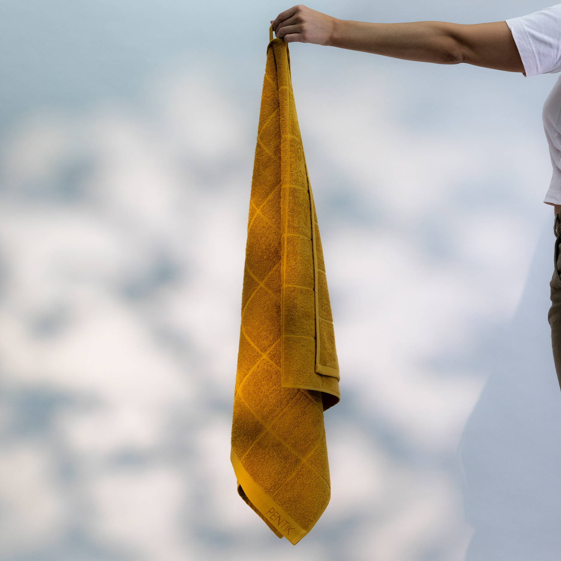 Yksinkertainen on kaunista. Yksivärinen Ruutu-kylpypyyhe ei koreile koristeilla, vaan hurmaa graafisella ryhdikkyydellään. Herkullisen tummankeltainen kylpypyyhe on kooltaan 70x140 cm ja sen materiaali on 100% puuvillafroteeta. Konepestävä 60 asteessa.