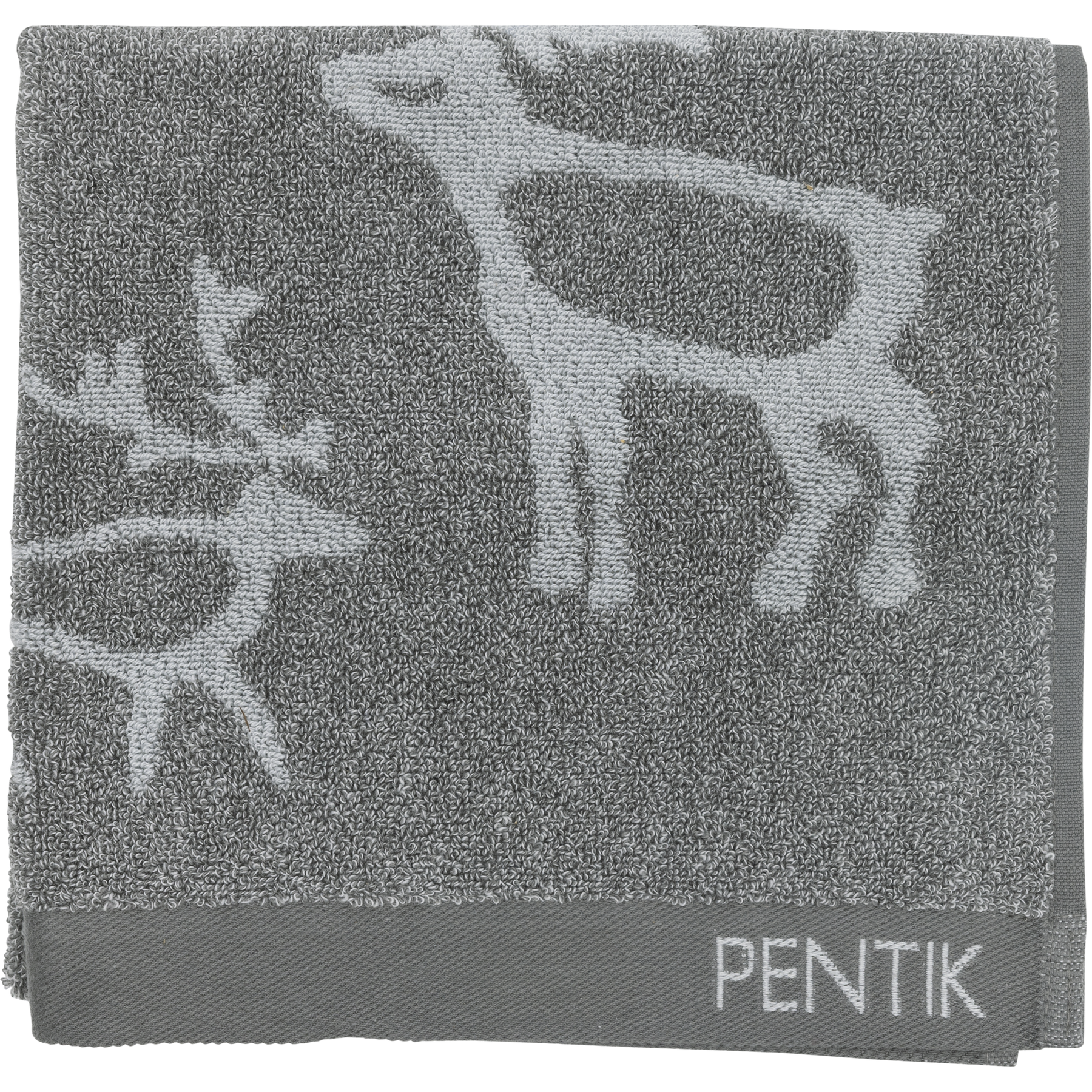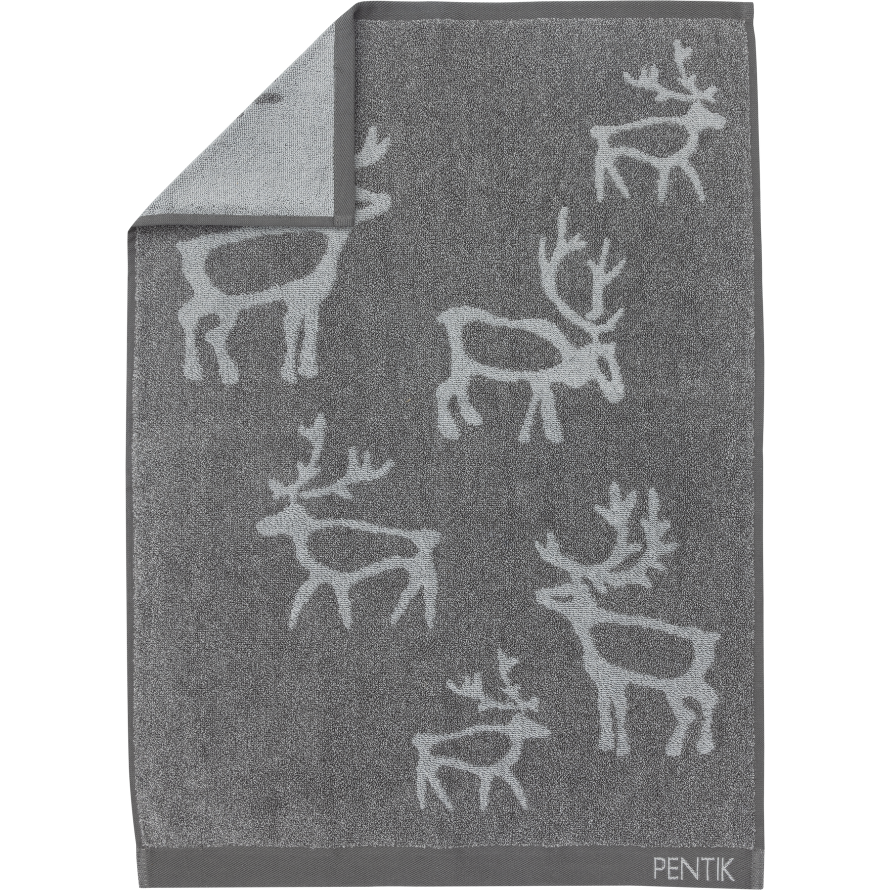 Harmaan Saaga-käsipyyhkeen koko on 50x70 cm. Pyyhe on 100% puuvillafroteeta ja sen voi pestä koneessa 60 asteessa.