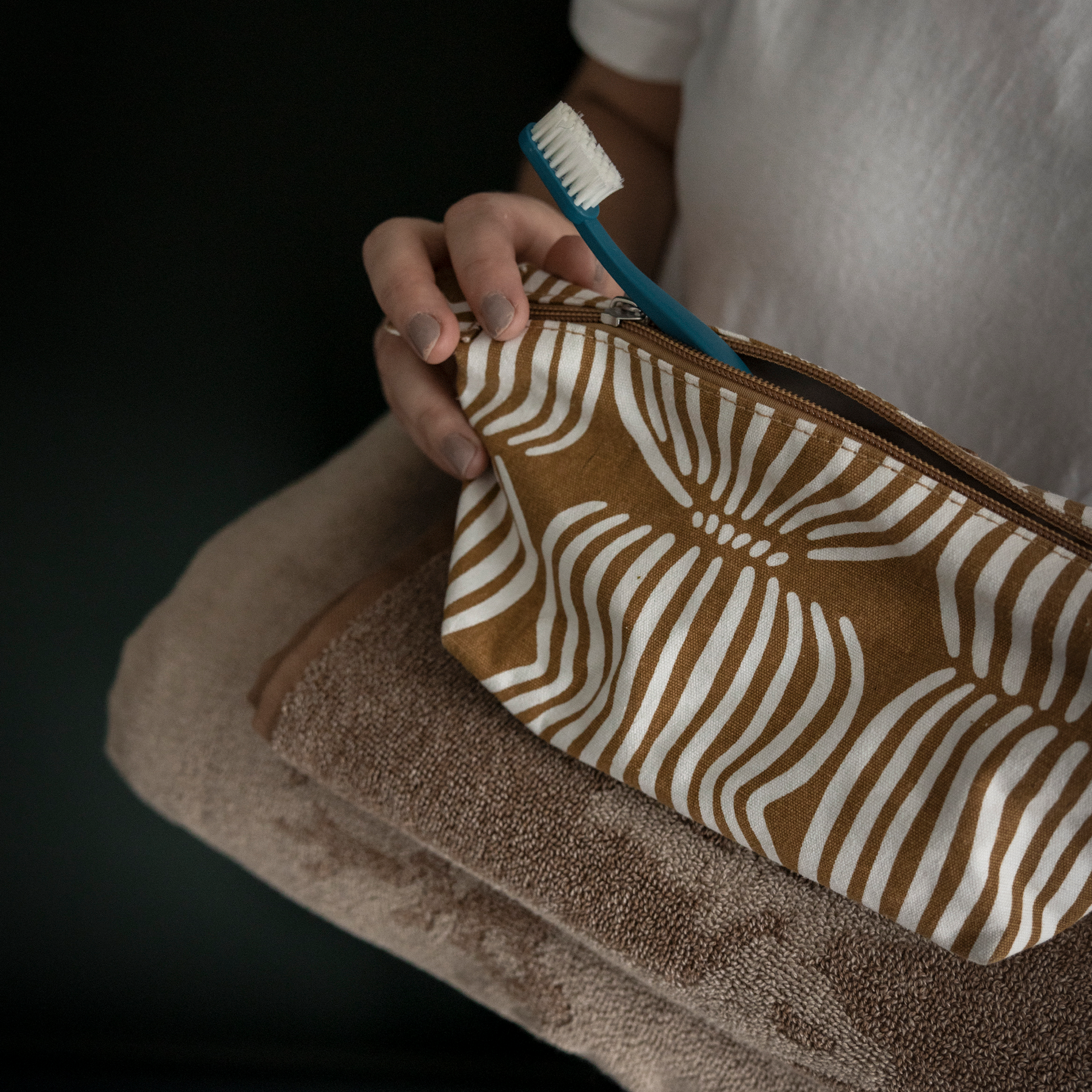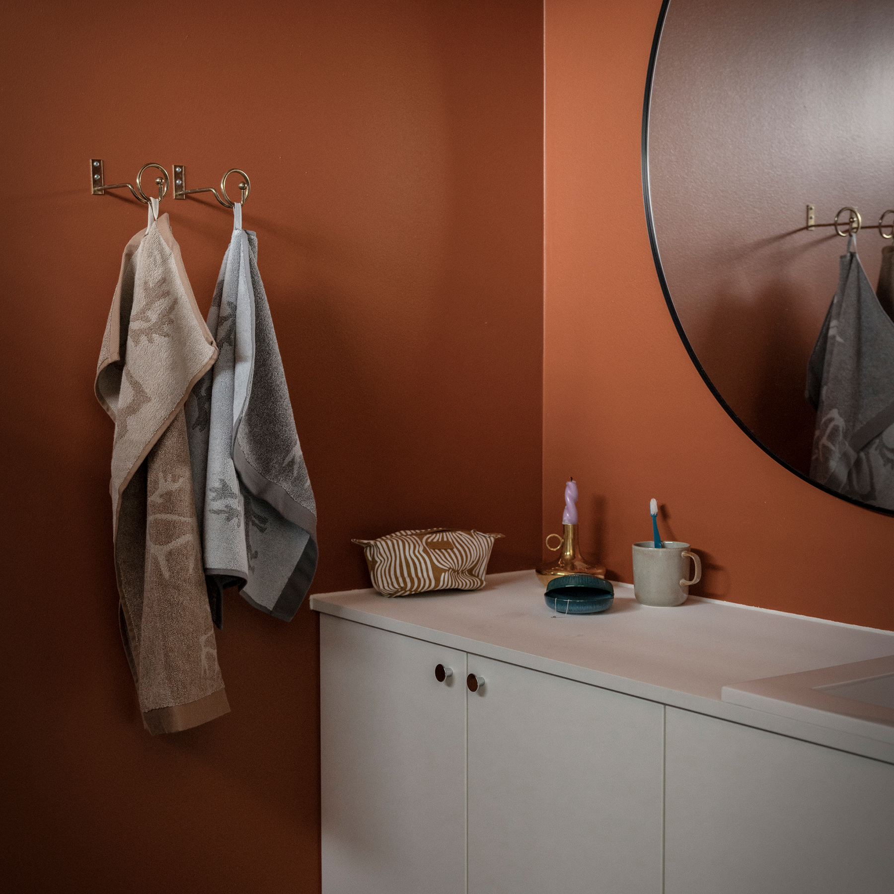 Lämpimän ruskean Saaga-käsipyyhkeen koko on 50x70 cm. Pyyhe on 100% puuvillafroteeta ja sen voi pestä koneessa 60 asteessa.