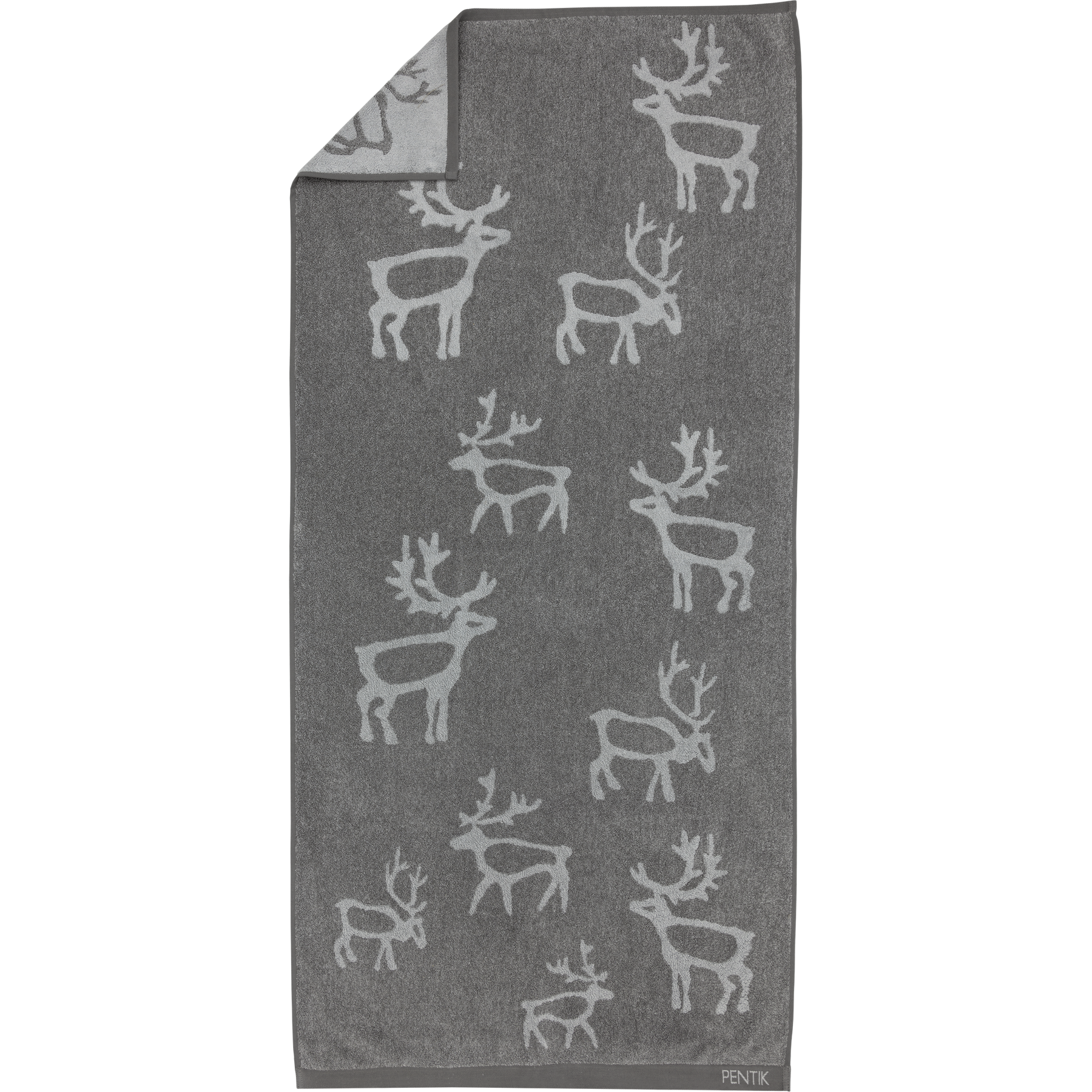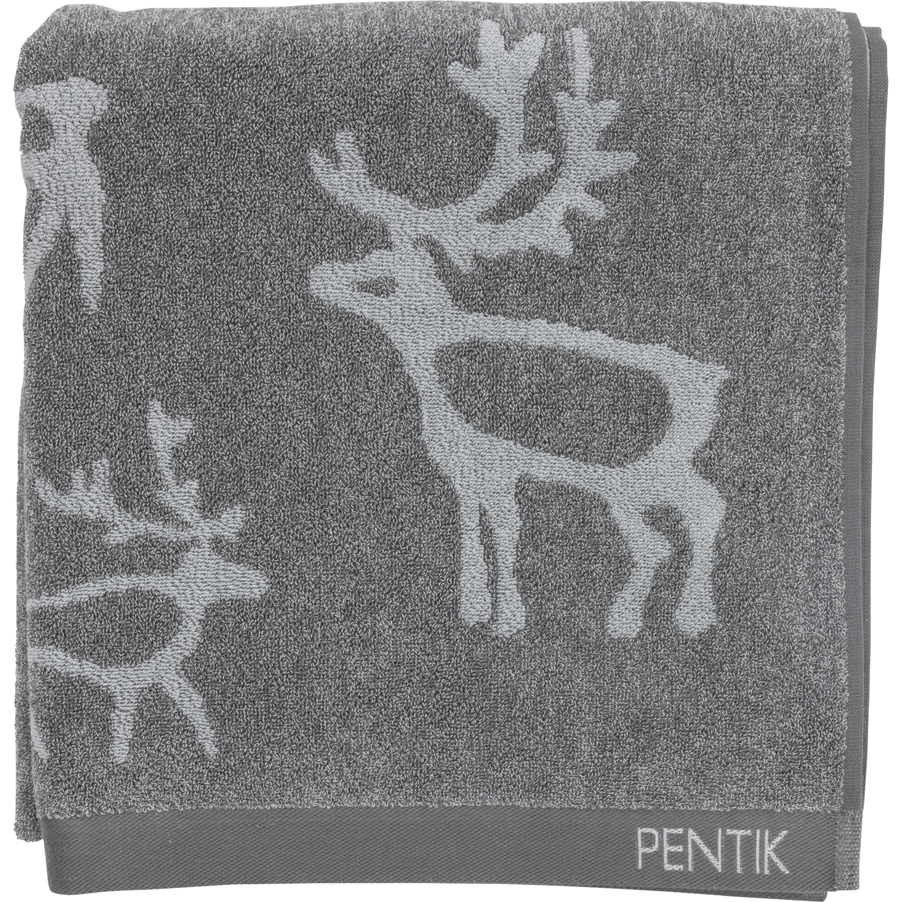 Harmaan Saaga-kylpypyyhkeen koko on 70x150 cm. Pyyhe on 100% puuvillafroteeta ja sen voi pestä koneessa 60 asteessa.