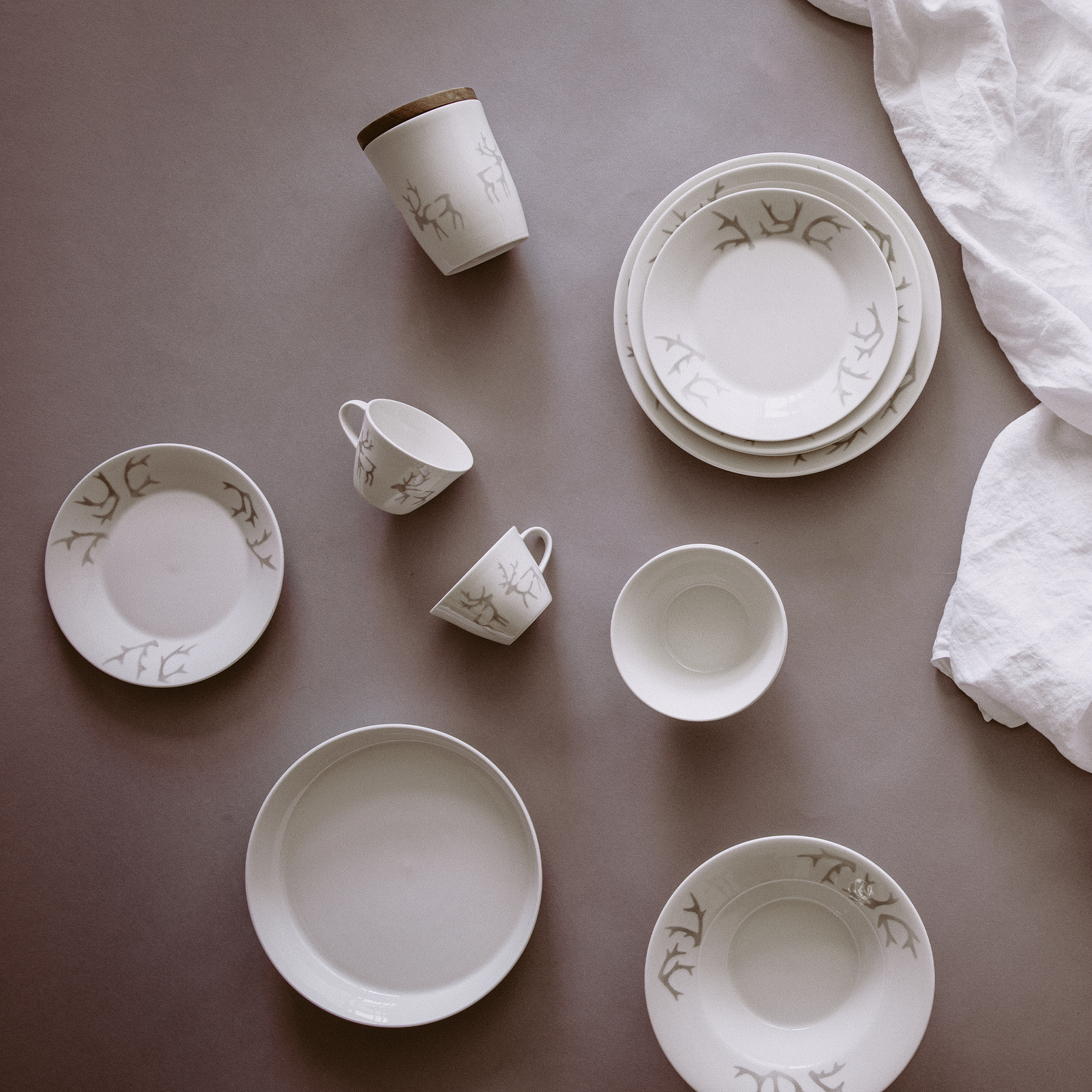 Poro on yleinen vieras Posion tehtaallamme, on joku kurkkinut ikkunastakin sisään. Poroja taas tullaan katsomaan maailman ääristä asti. Saaga-sarjassa porot seikkailevat astioissa ja kuoseissa — aina pöytäliinoista lakanoihin ja pyyhkeisiin. Voit siis hyvin kuvitella vaikka uinuvasi porovaljakon kyydissä. Astiaston muodon on suunnitellut Lasse Kovanen ja kuvionnin Minna Niskakangas.