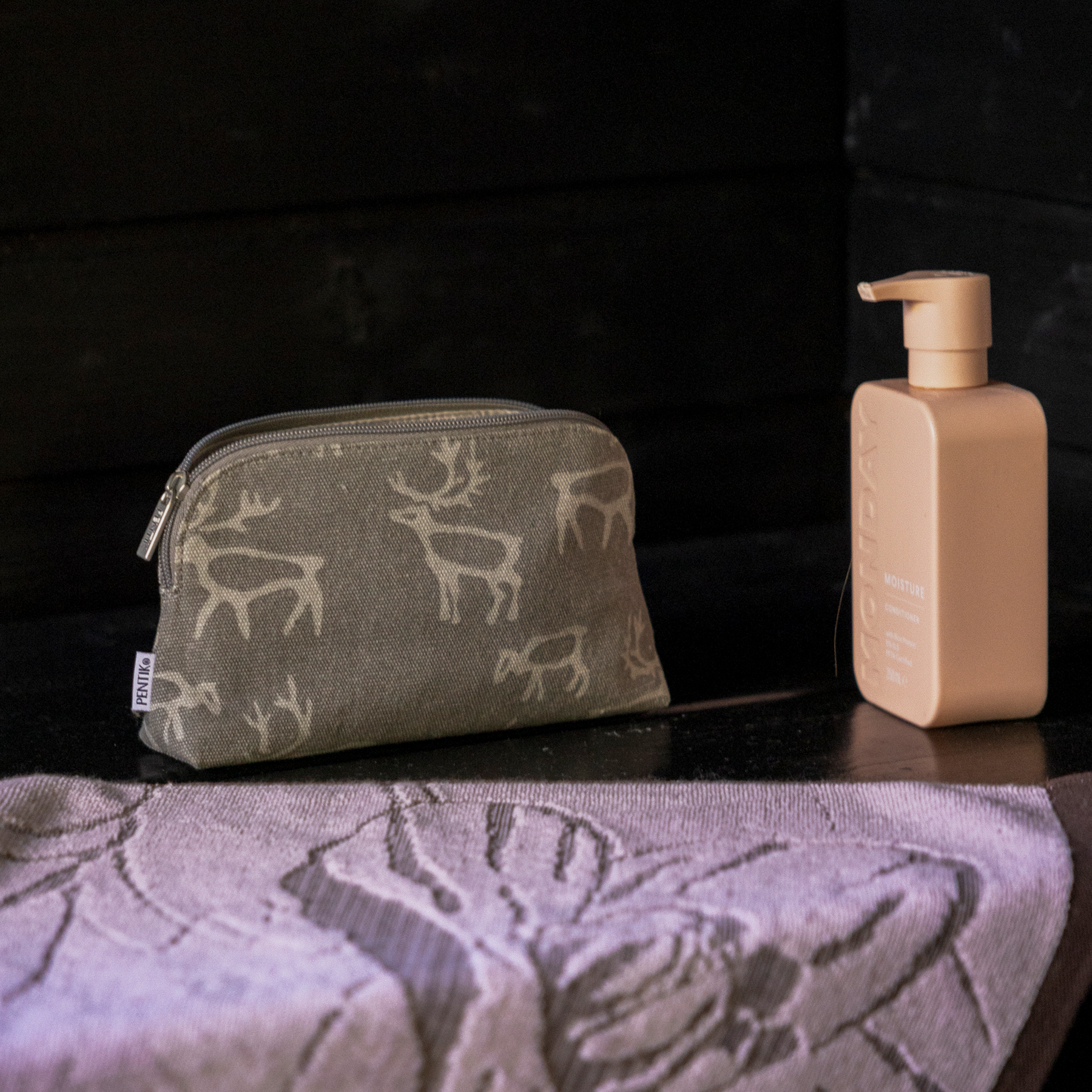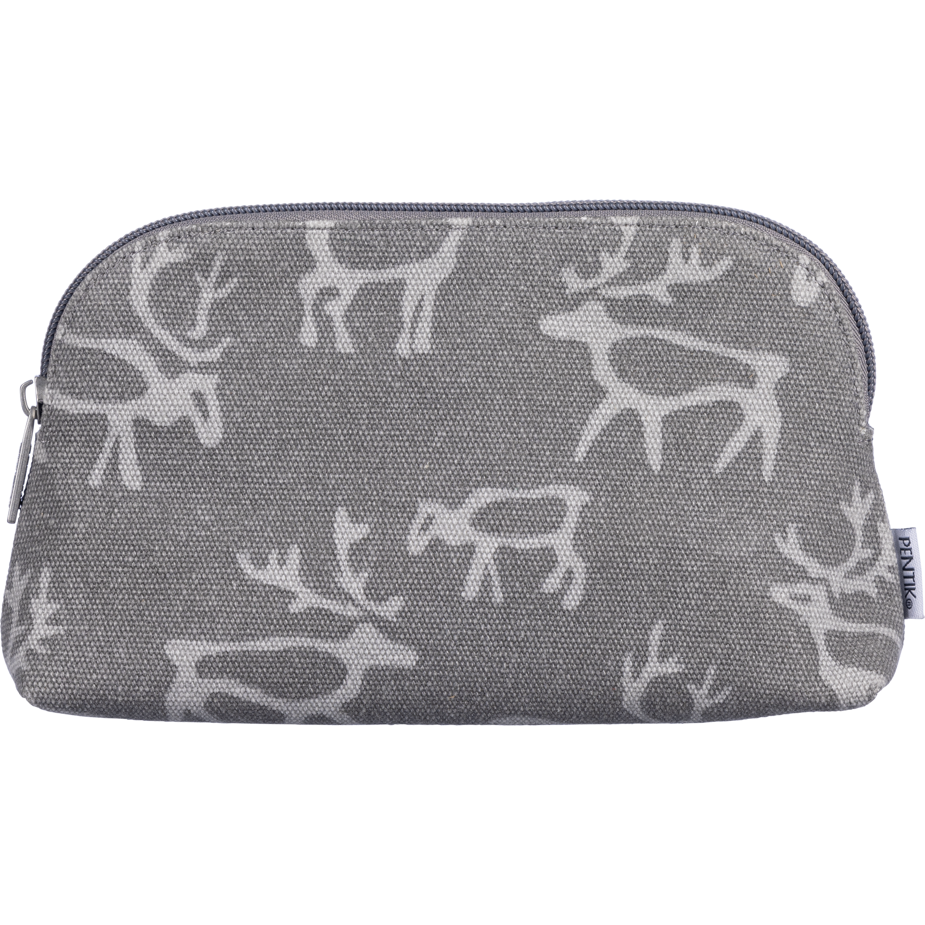 Vetoketjulla suljettava harmaa Saaga-pussukka on puuvillaa ja kooltaan 5x12x20 cm.