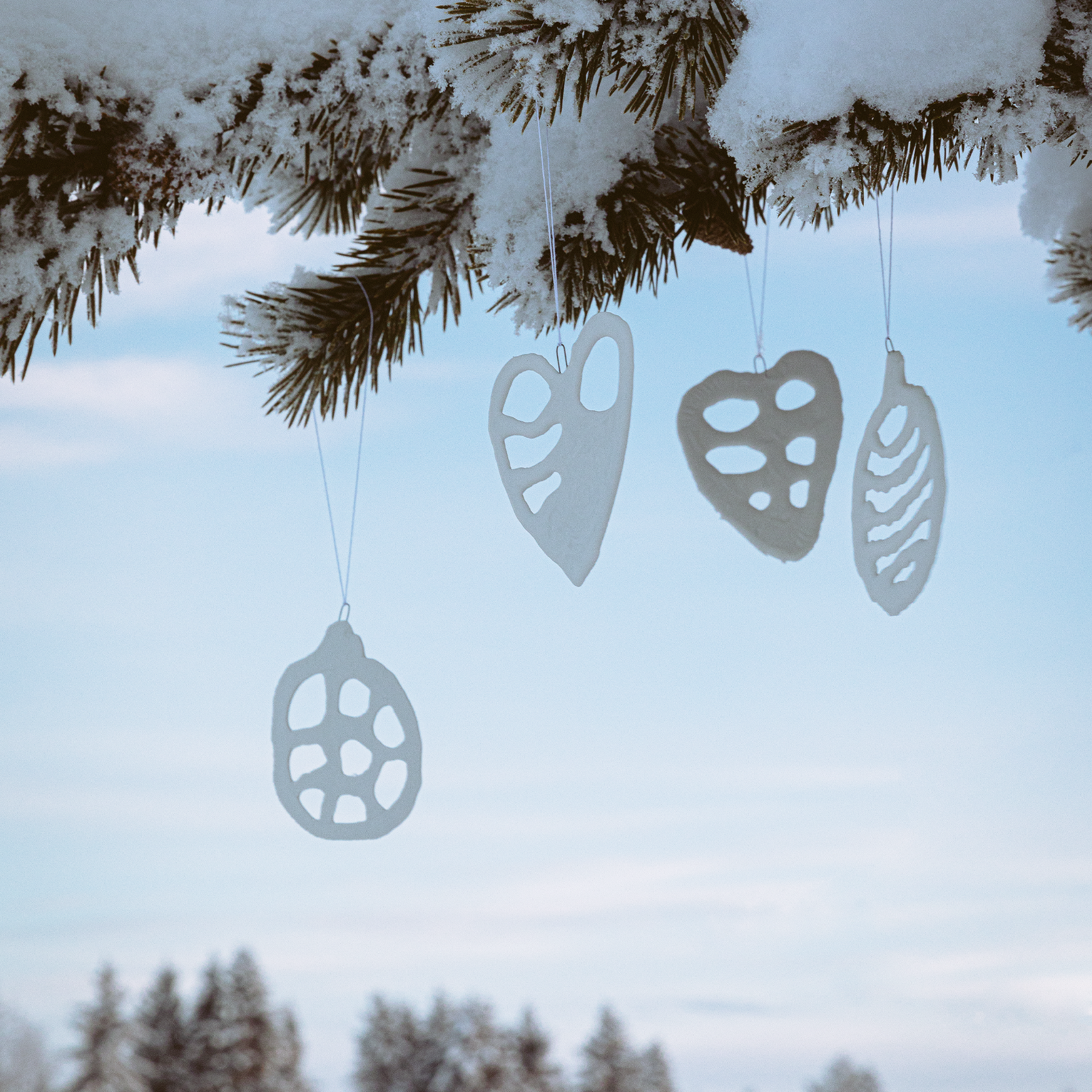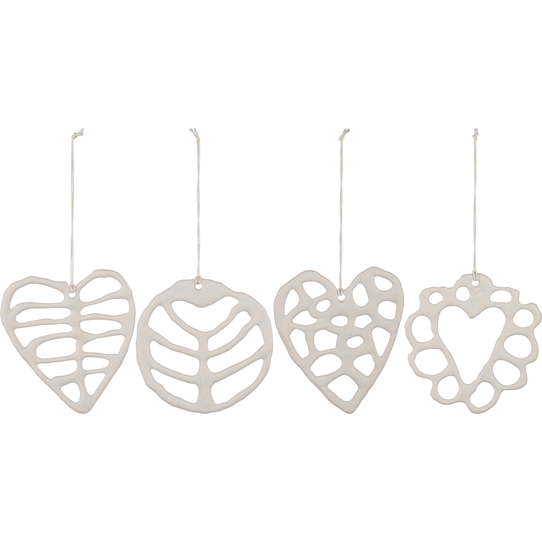 Studio Keramiikkakoristesetissä on neljä valkoista, 9x10 cm kokoista koristetta, joissa on ripustusnauhat. Valmistettu käsin Suomessa Posiolla, maailman pohjoisimmassa keramiikkatehtaassa.