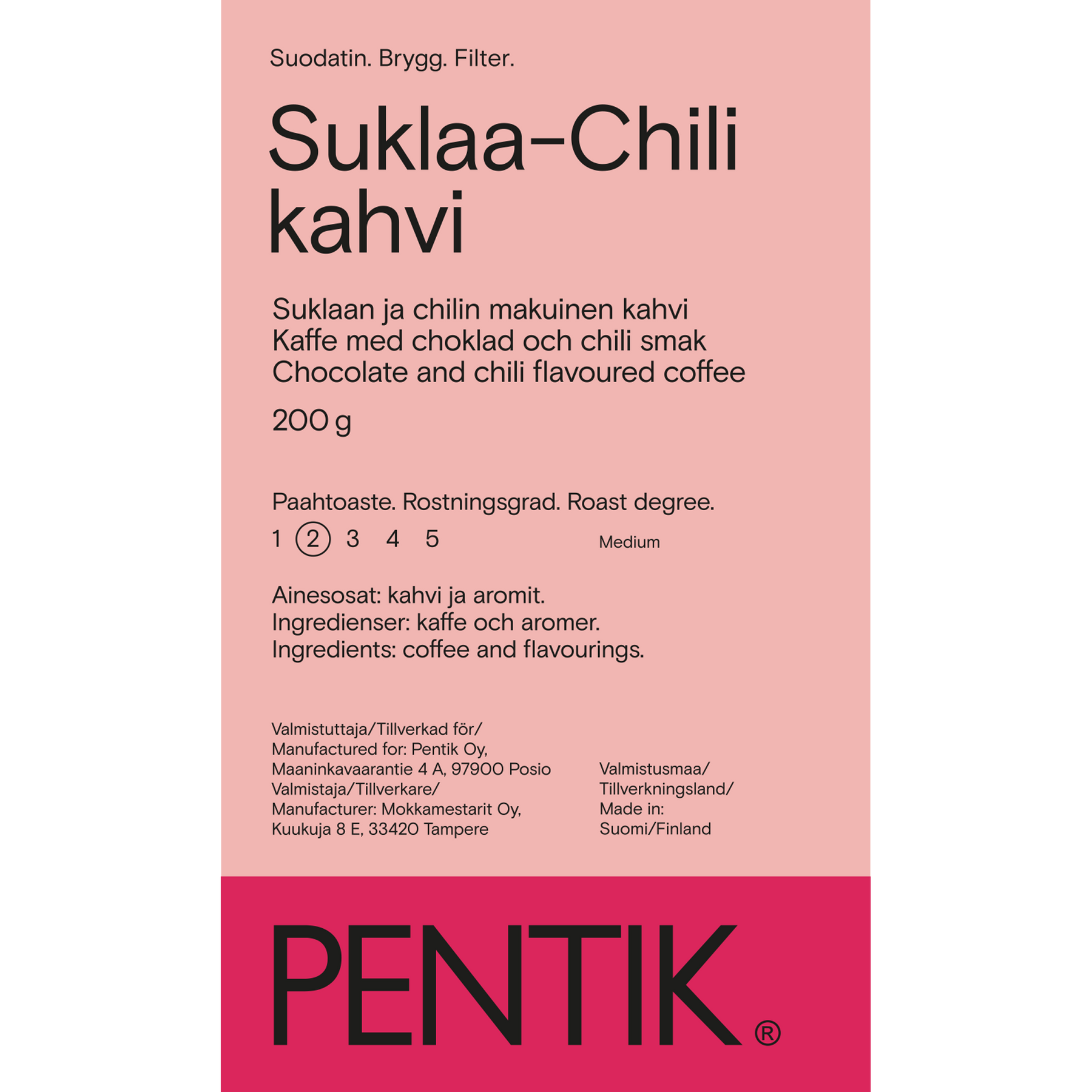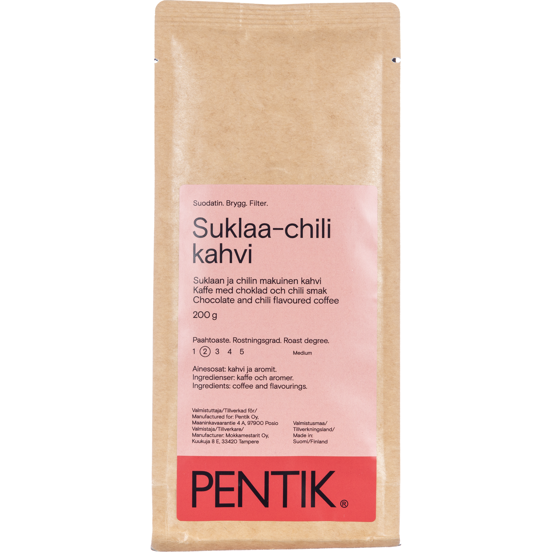 Suomalaisten suosikkijuoma. Lisätty tujaus chiliä. Suklaa-chilikahvin maku yllättää pienellä tulisuudellaan. Makukahvi sopii yksin tai yhdessä vietettyihin kahvihetkiin tai herkkulahjaksi. Kahvissa käytetään Arabica-kahvilaatua ja se valmistetaan Suomessa, Tampereella Mokkamestareiden kahvipaahtimolla. Jos haluat nauttia makukahvin aromit voimakkaimmillaan, keitä se sellaisenaan tavallisen suodatinkahvin tapaan. Voit myös sekoittaa suklaa-chilikahvia lempisuodatinkahvisi sekaan. Suodatinjauhatus.