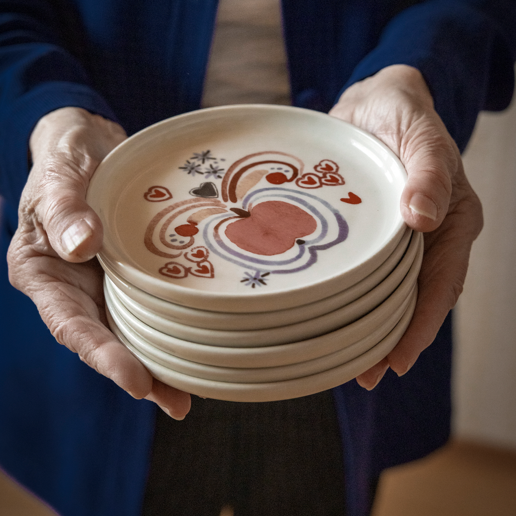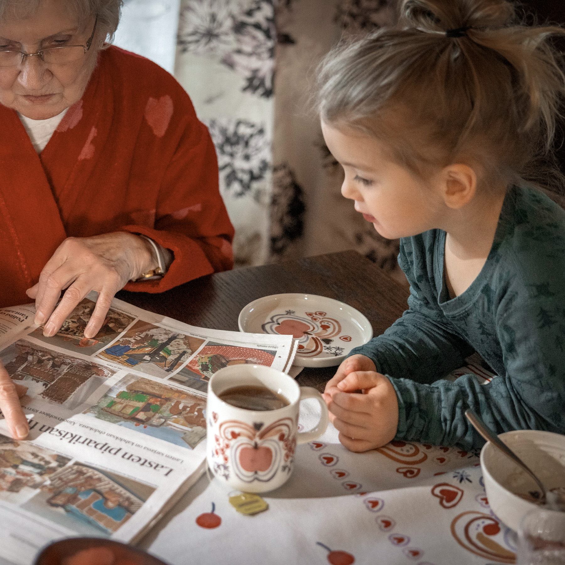 Pohjoisten kotien liinavaatekaappien vakiovarustukseen kuuluvat aikaisempien sukupolvien käsin kirjailemat perintötekstiilit. Usein ne ovat niin rakkaita ja käytössä kuluneita, että on turvallisinta antaa niiden levätä kaapissa. Talviomena-mallistoa suunnitellessaan Minna Niskakangas sukelsi kirjonnan maailmaan. Vesiväreillä maalaten perinteiset kuvioaiheet muotoutuivat moderniksi tulkinnaksi näistä suvuissamme kiertävistä aarteista. Talviomena-kuosi on sommiteltu kuhunkin malliston tuotteeseen parhaiten sopivaksi. Värimaailmassa on perinteisistä pohjoismaalaisista kirjontatöistä tuttua valkoista, sinistä, punaista ja ruskeaa. Malliston astiat ja tekstiilit tuovat lämmintä kanelin ja omenan tuoksua jouluvalmisteluihin.