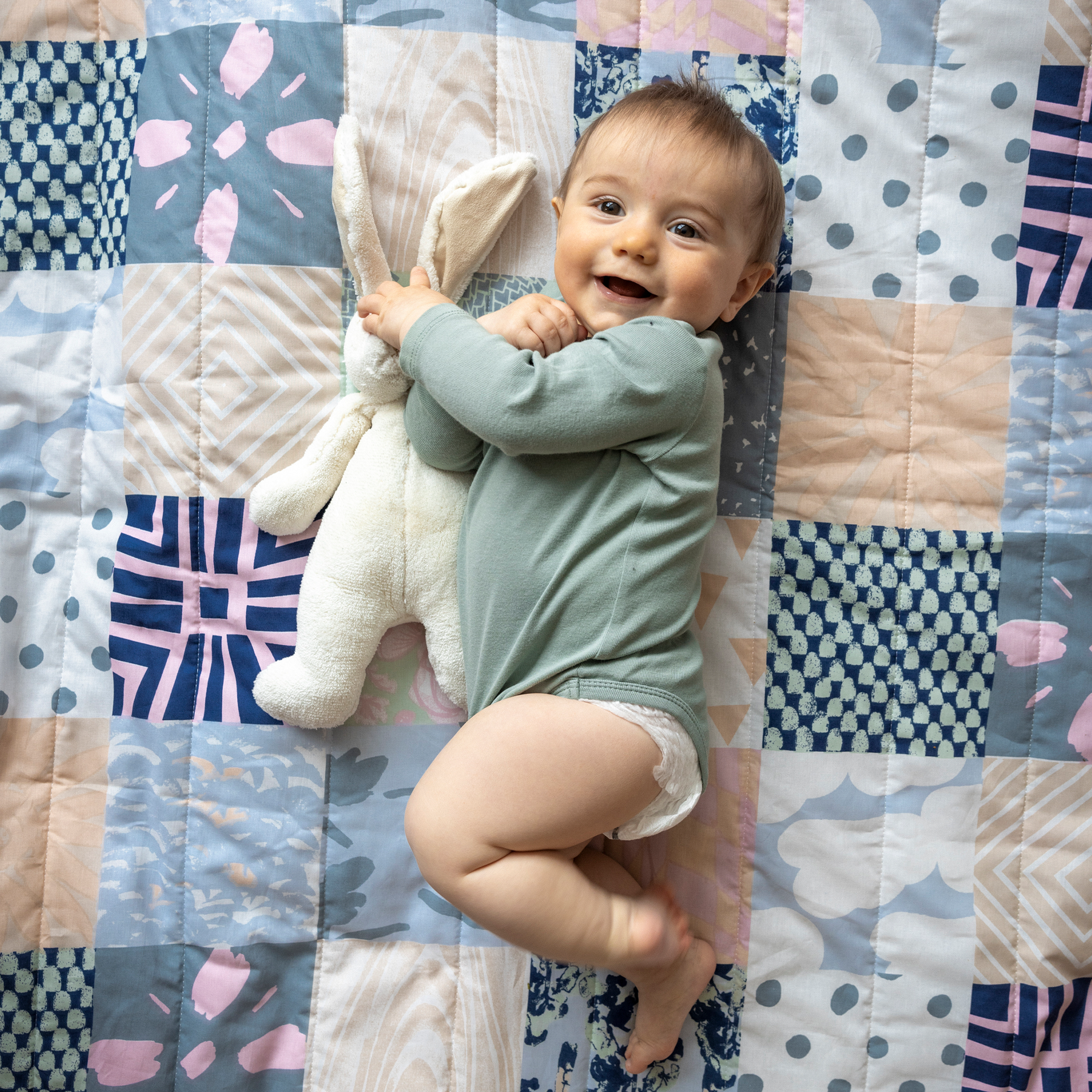 Pieni hetki sieltä, toinen täältä. Lasse Kovasen suunnittelemaan Tilkkutäkki-päiväpeittoon on kuvattu muistoja mökillä vietetyistä kesistä: räsymattoja, puun kaarnaa, laineilevaa vettä, mustikoita, helteisenä tuoksuvaa metsää ja tietysti kirkkaana porottava aurinko. Tilkkutäkki-päiväpeiton pastellinen värimaalima sopii hyvin valkoiseen ja puunväriseen sisustukseen.