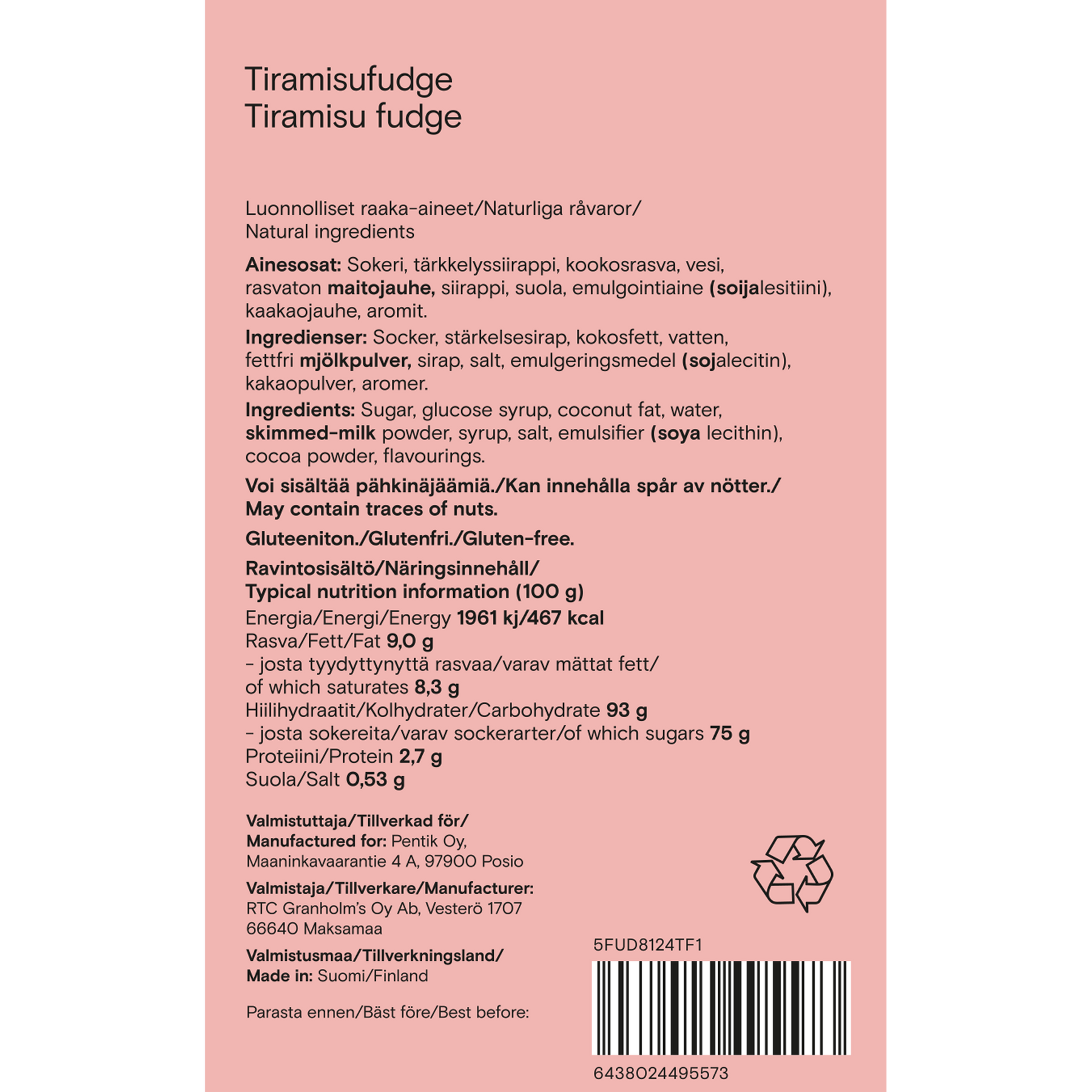 Tiramisufudge eli pehmeä toffee valmistetaan Pohjanmaalla, Granholmin herkkutehtaalla käsityönä. Työ on hidasta, sillä palat muotoillaan käsin ja annetaan kypsyä ennen pakkausta ja toimitusta. Tiramisufudge on gluteeniton ja se valmistetaan ilman säilöntä- ja väriaineita. Pentikin herkut tyynnyttävät oman makeannälän ja sopivat hyvin myös lahjaksi. Valmistettu Suomessa.