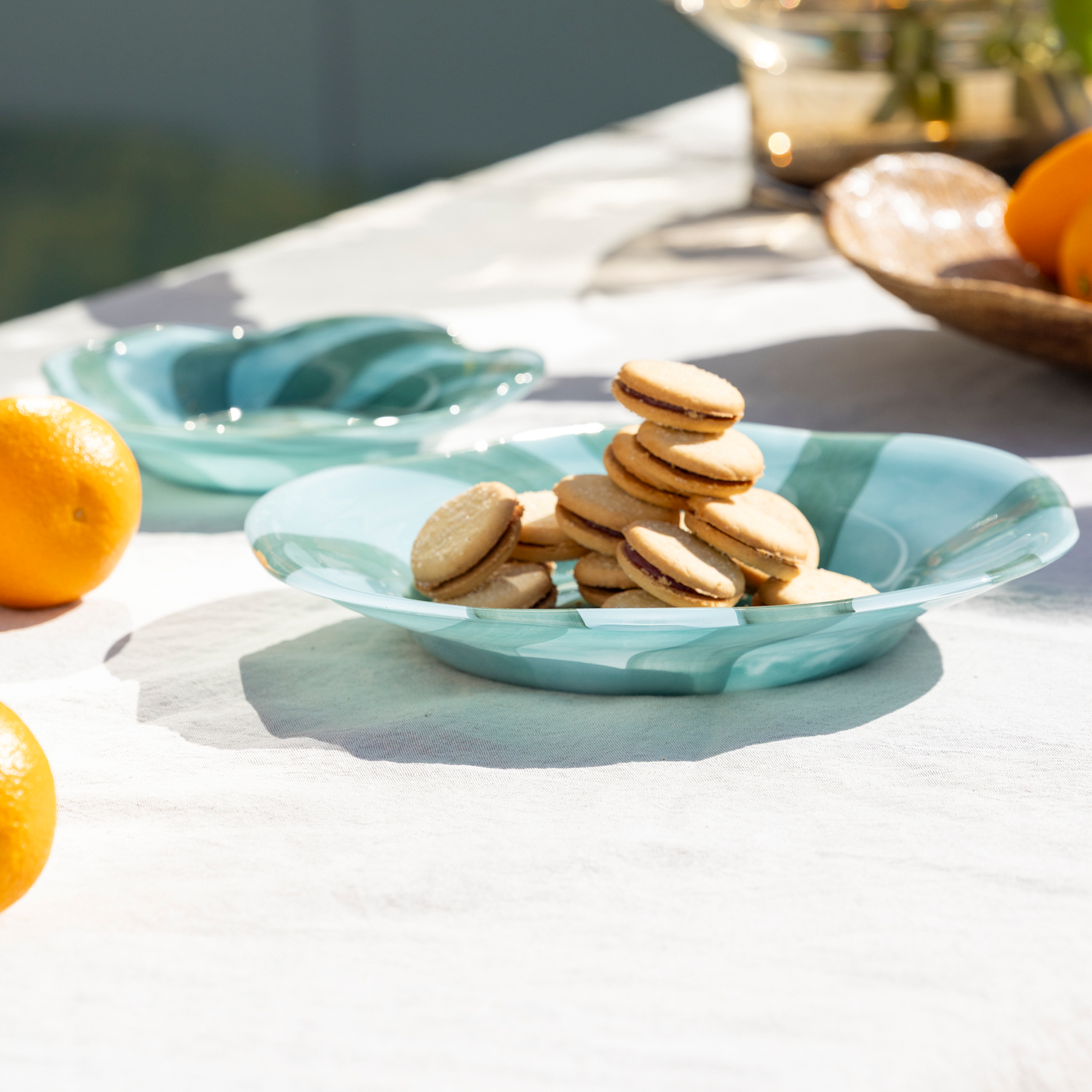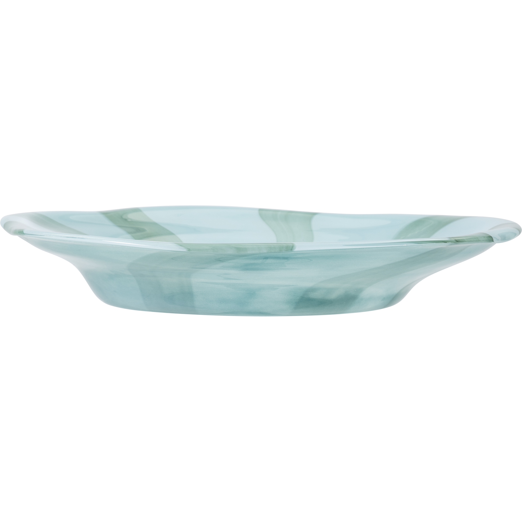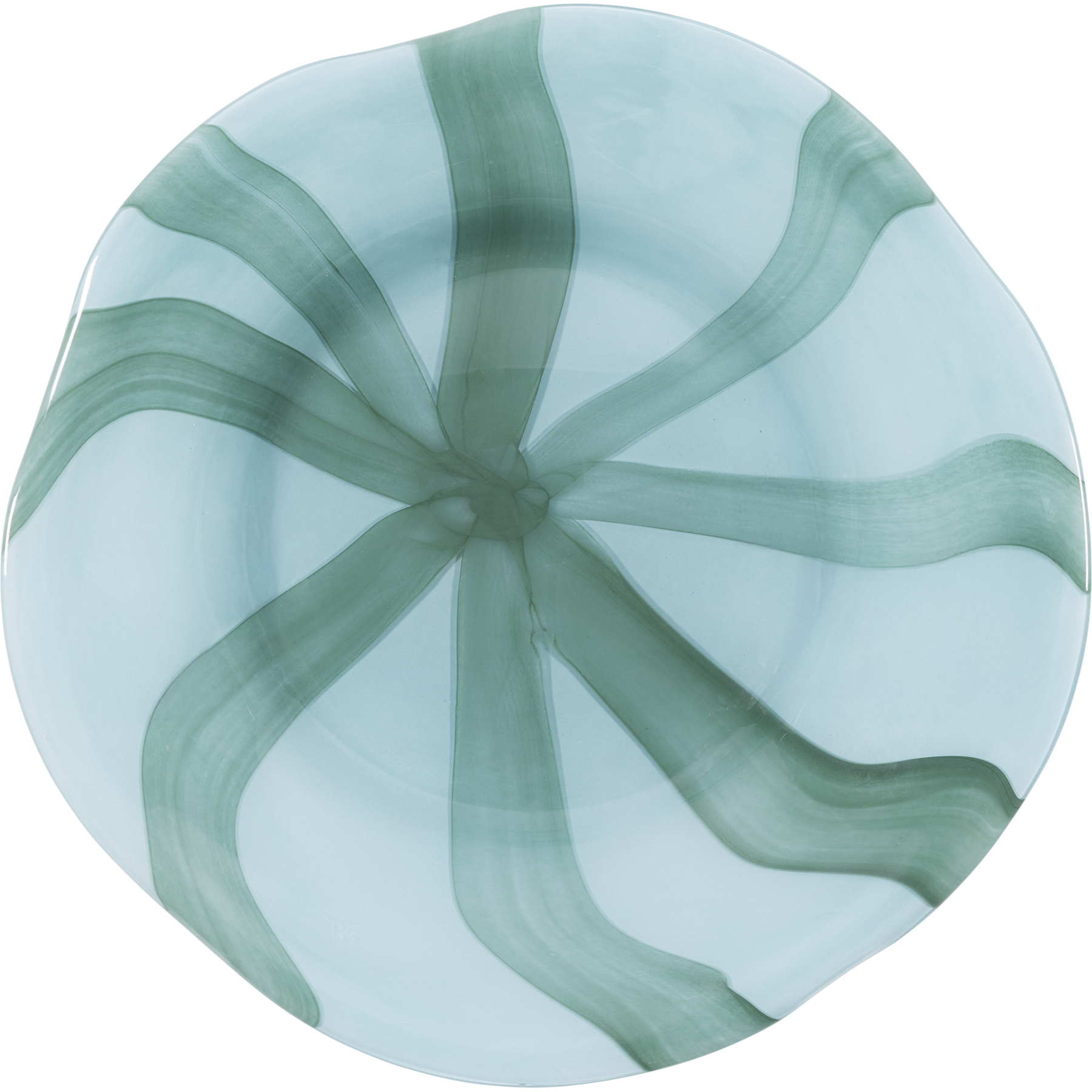 Turkoosi Tivoli-lasilautanen on halkaisijaltaan 30 cm. Tuotteet ovat uniikkeja, joten niiden ulkonäkö voi vaihdella hieman kuvassa olevasta kappaleesta.