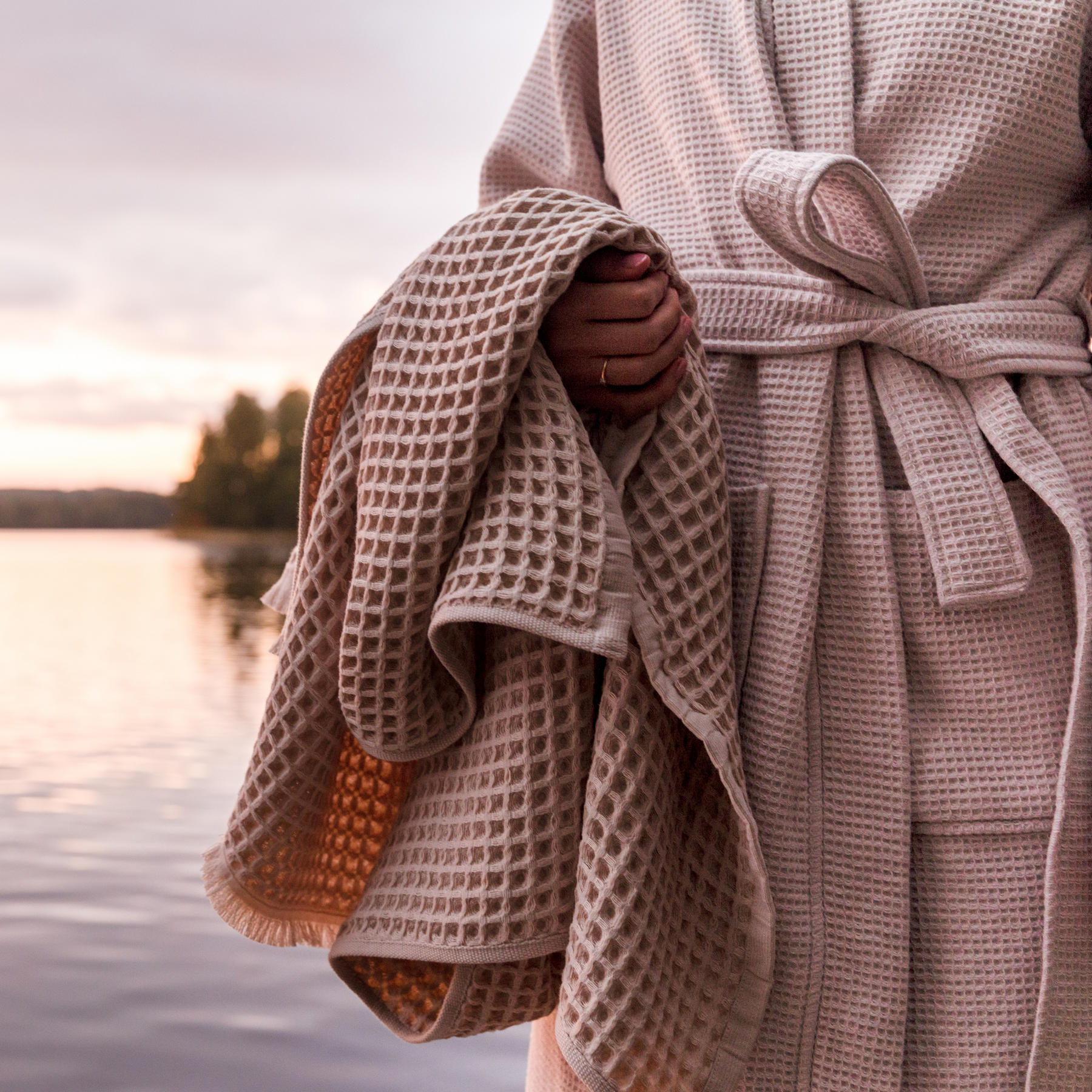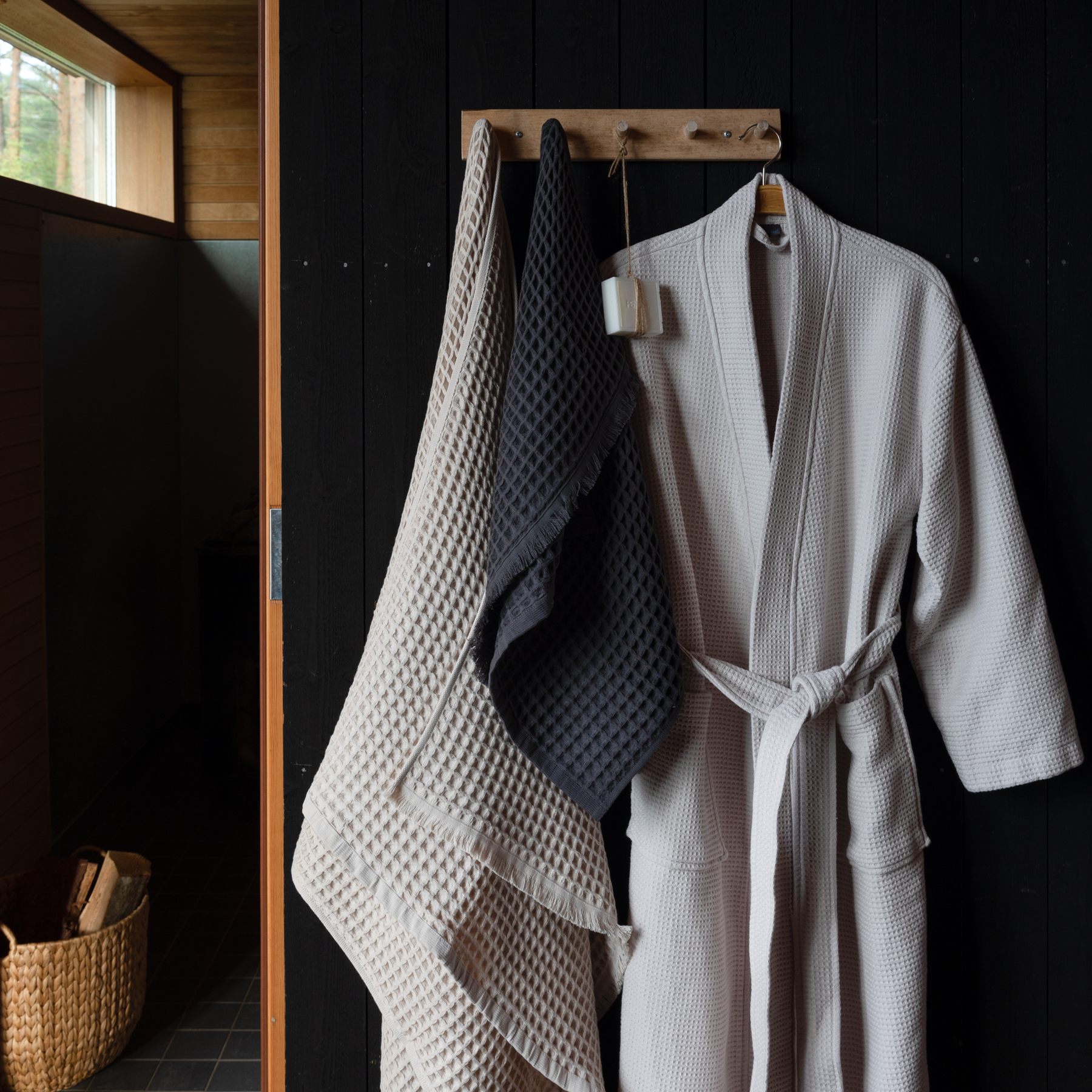 Pohjoisen karusta, mutta kauniista luonnosta ammentava Spa-mallisto tuo puhtaan ja rentouttavan henkäyksen kylpyhuoneeseen ja saunaan. Puuvillaiseen Tundra-kylpytakkiin on ihana kietoutua kylpyhetken tai saunomisen jälkeen. Vaaleanruskea kylpytakki on pienempää kokoa (S-M).