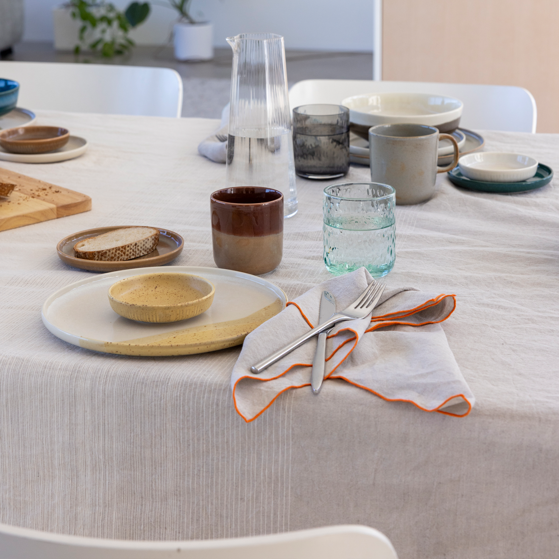 Tuntu-malliston puolipellavainen pöytäliina on kooltaan 145x250 cm. Se on 50 % puuvillaa ja 50 % pellavaa.
