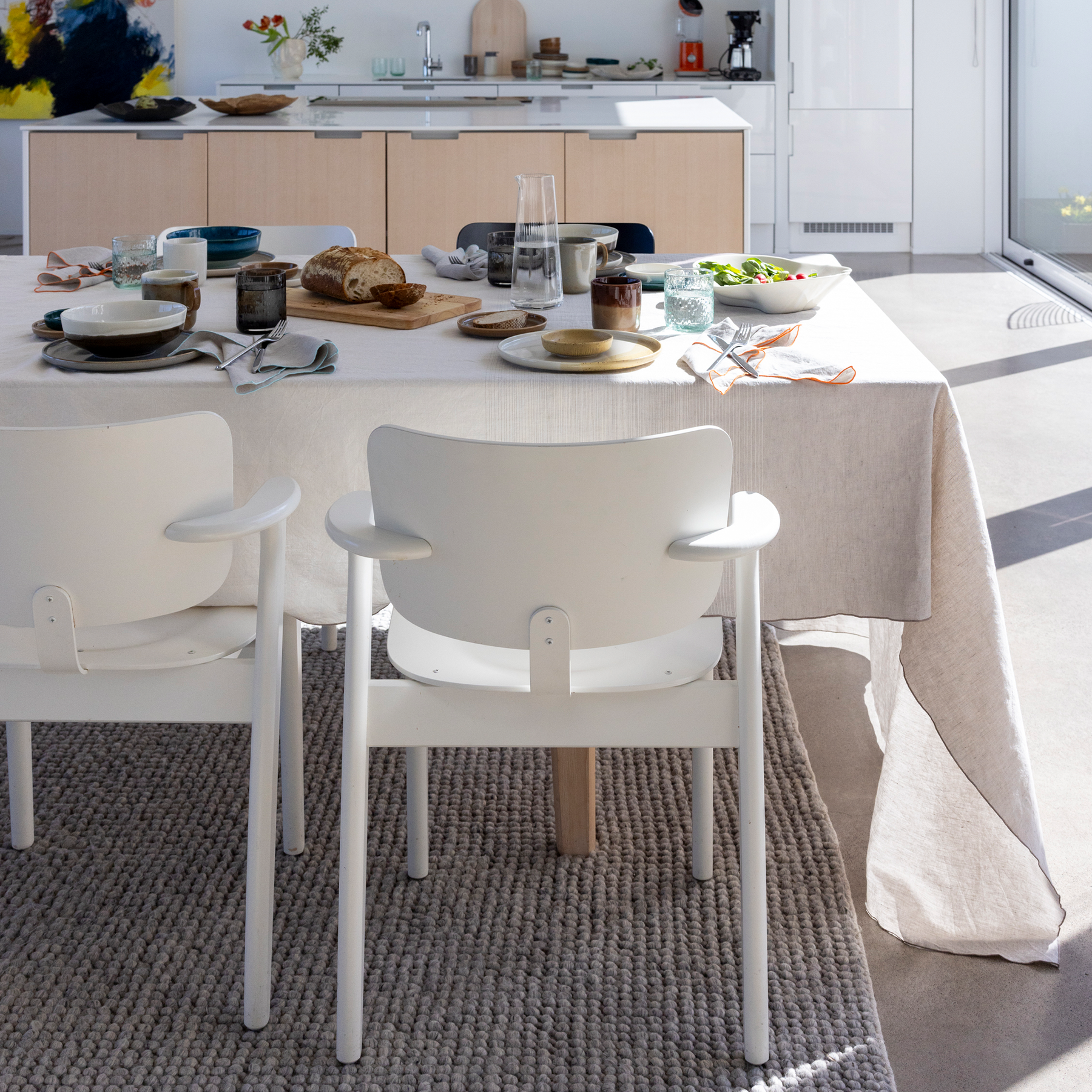 Talveksi värit katoavat pohjoisen luonnosta. Ehkä ne lentävät lintujen mukana etelään, lataavat siellä aurinkoa ja lämpöä itseensä ja palaavat keväällä hehkuvampina kuin koskaan. Värien rohkaisemana koti sisustetaan nyt juuri siten, kuin itsestä hyvältä tuntuu. Tuntu-astioista lainatut värit loistavat nyt myös tekstiileissä, joita löytyy aina torkkupeitoista kattaus- ja keittiötekstiileihin. Tuntu-pöytäliina tuo jo yksistään iloa, leikkisyyttä ja väriä keittiöön, mutta parhaimmillaan se on saman sarjan muiden kattaustekstiilien, sekä tietysti Tuntu-astioiden seurassa.