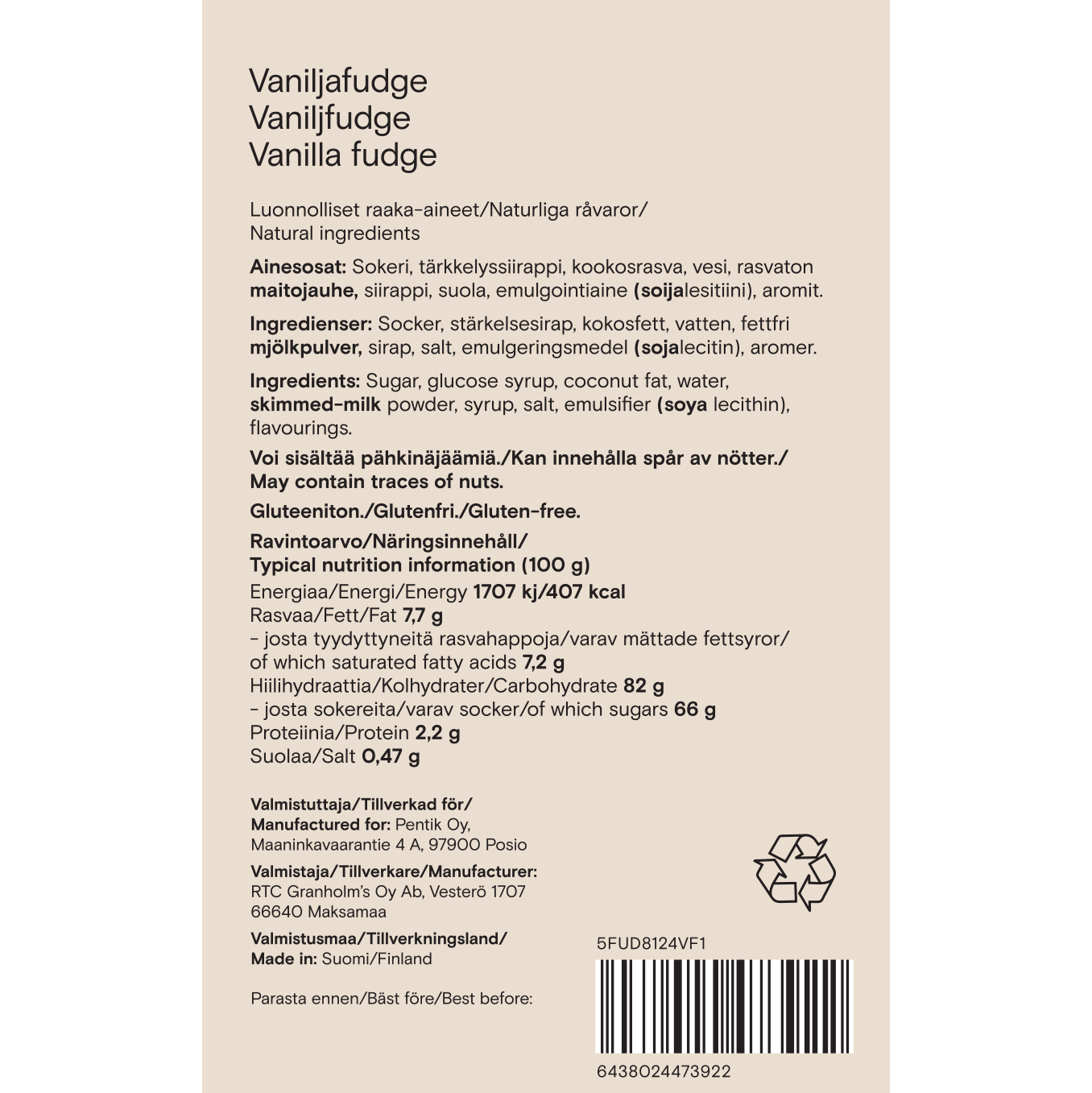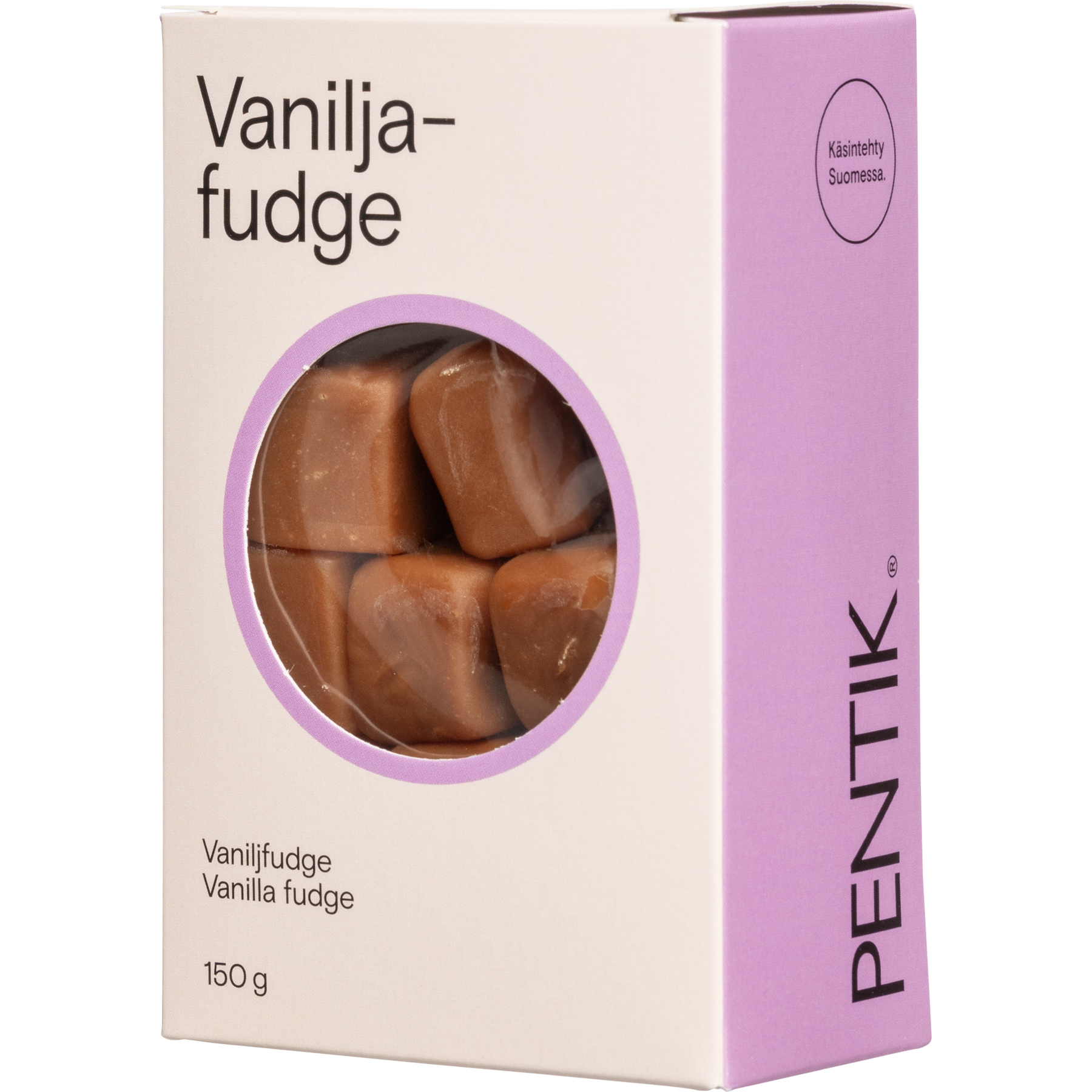 Vaniljafudge eli pehmeä toffee valmistetaan Pohjanmaalla, Granholmin herkkutehtaalla käsityönä. Työ on hidasta, sillä palat muotoillaan käsin ja annetaan kypsyä ennen pakkausta ja toimitusta. Fudget ovat gluteenittomia ja ne valmistetaan ilman säilöntä- ja väriaineita. Pentikin herkut tyynnyttävät oman makeannälän ja sopivat hyvin myös lahjaksi. Valmistettu Suomessa.