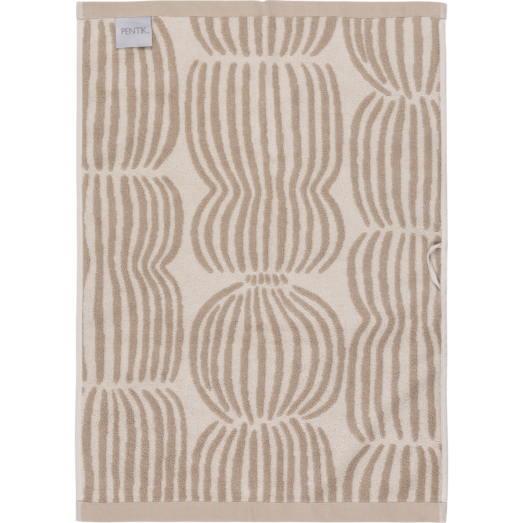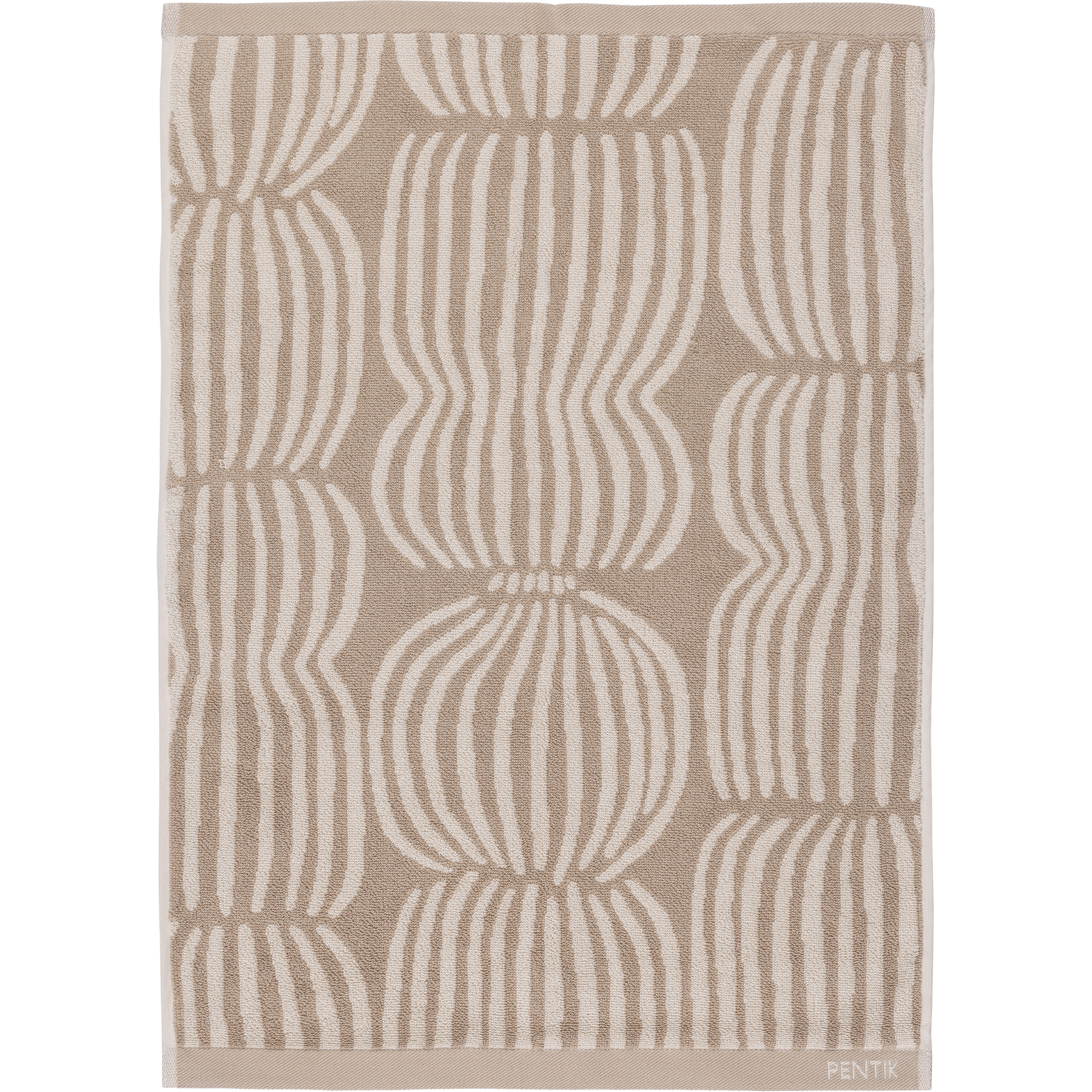 Vilja-käsipyyhkeen mitat ovat 50x70 cm. Vaaleanruskea pyyhe on 100% puuvillaa ja sen voi pestä koneessa 60 asteessa.