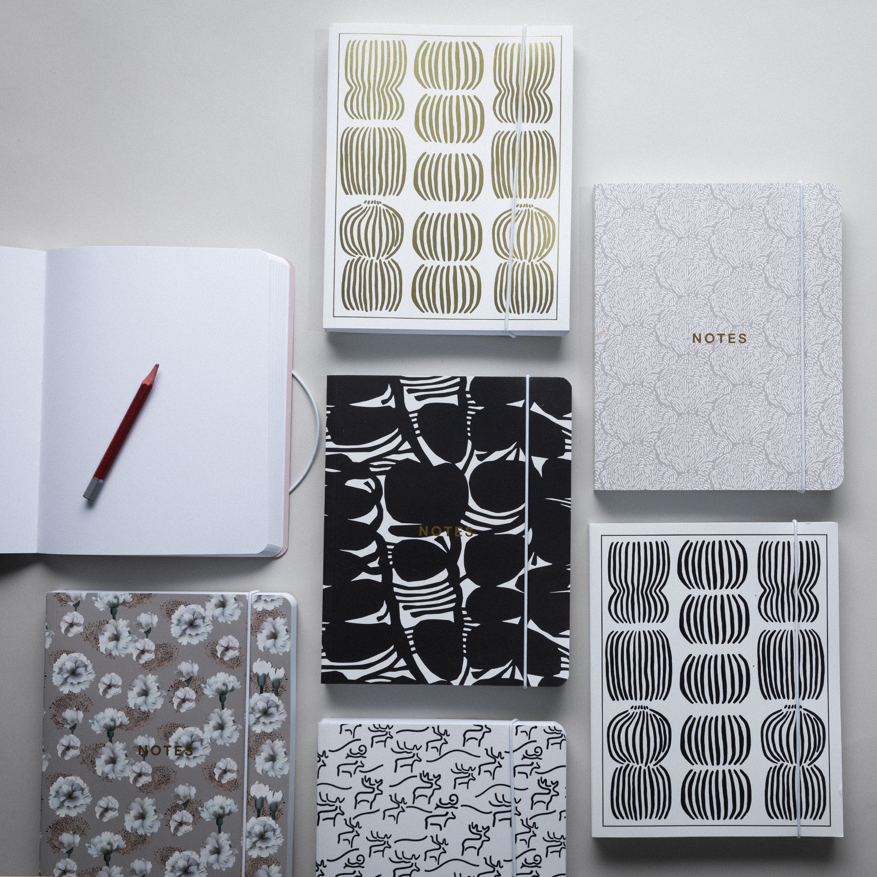 Kauniin muistikirjan kantta koristaa Minna Niskakankaan näyttävä, graafinen Vilja-kuosi mustavalkoisena. Muistikirjassa on 256 sivua, joten siihen mahtuu runsaasti suunnitelmia, päiväkirjamerkintöjä, to do -listoja tai piirroksia. Muistikirjan koko on 16x20 cm.