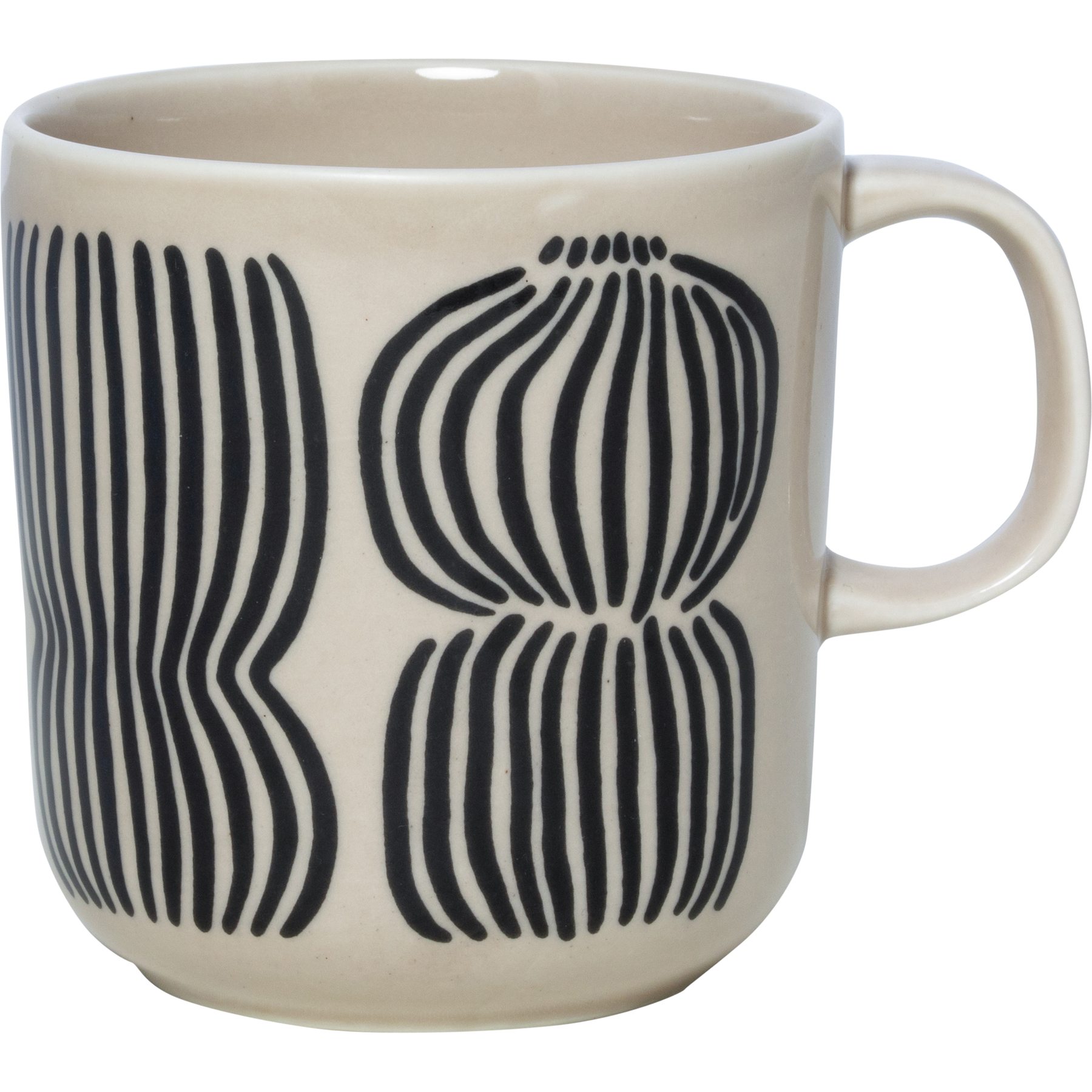 Beigen, Vilja-kuvioisen Tuntu-mukin vetoisuus on 0,35 litraa. Mukin voi pestä koneessa ja sitä voi huoletta käyttää sähköuunissa, leivinuunissa, mikroaaltouunissa sekä pakastimessa. Valmistettu Suomessa.