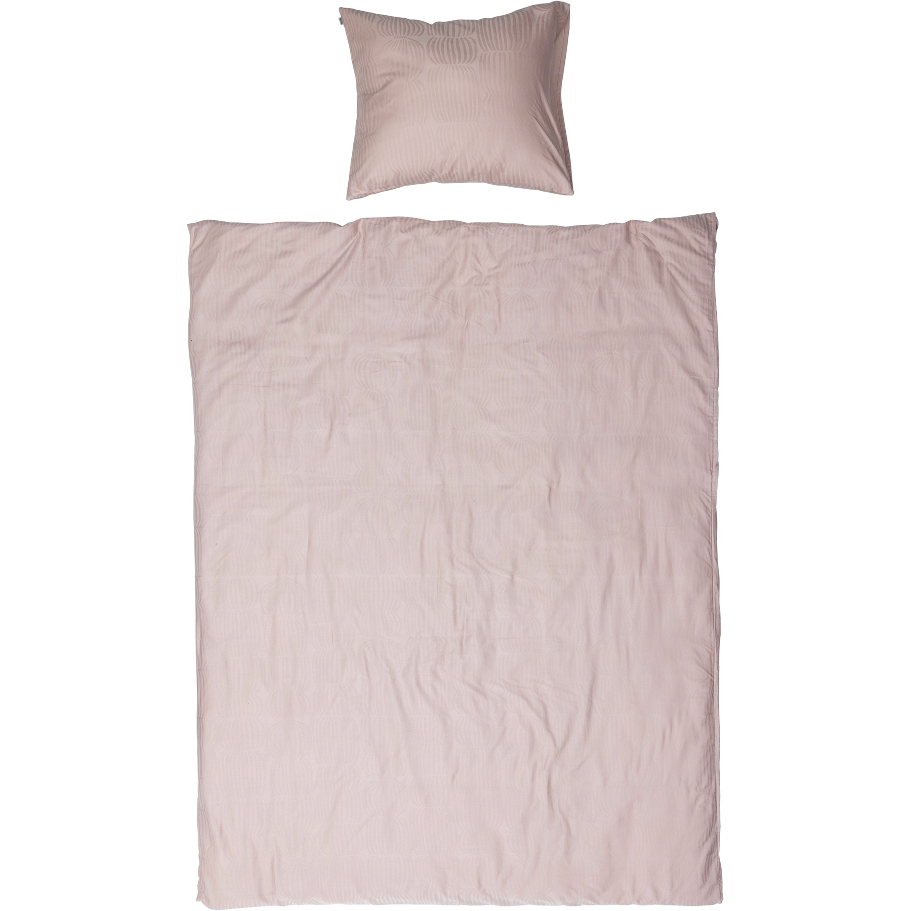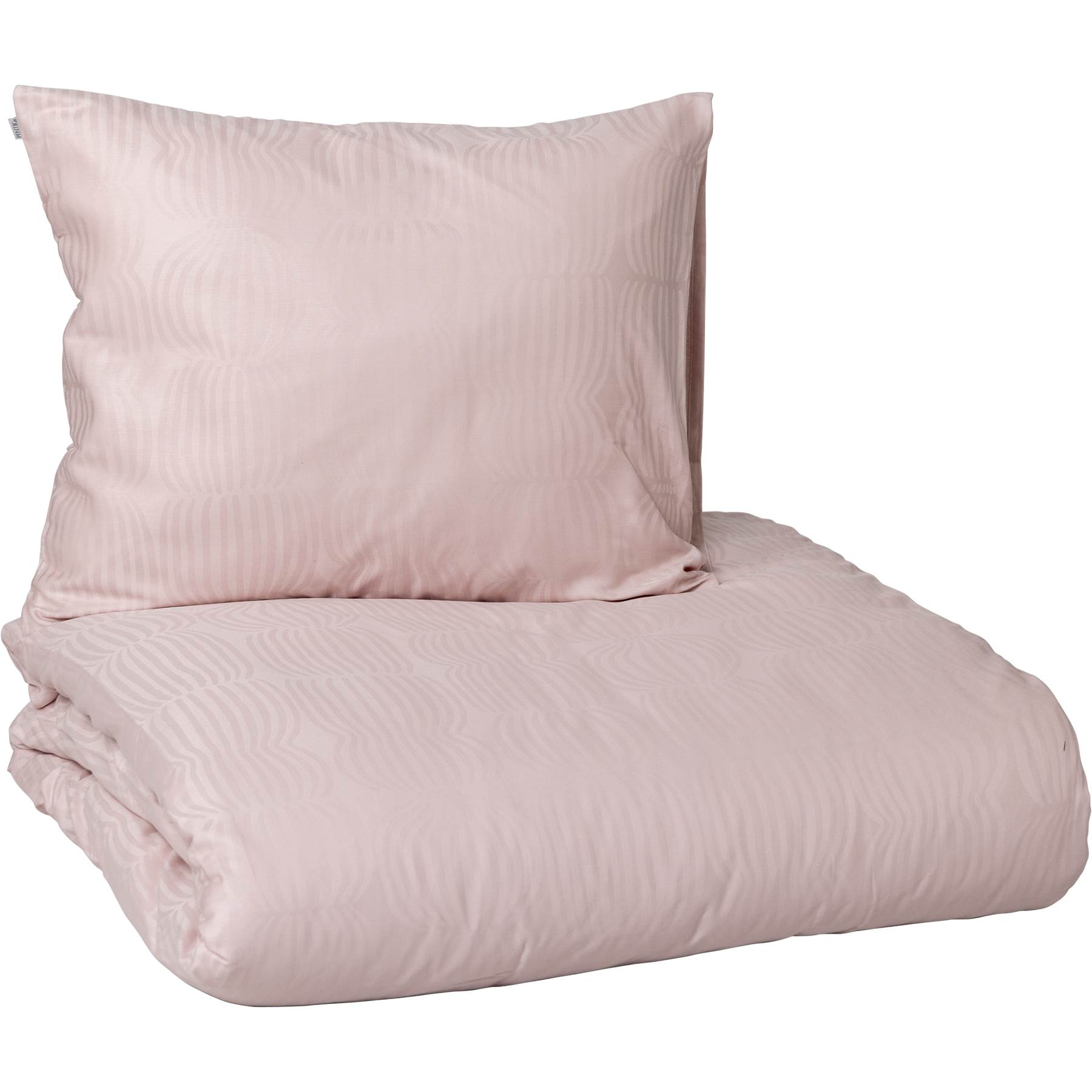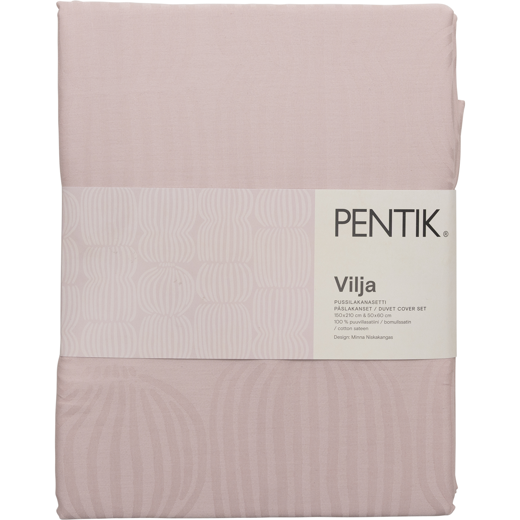 Vaaleanpunaisen Vilja Jacquard pussilakanan koko on 150x210 cm ja tyynyliinan koko on 50x60 cm. Valmistettu 100% puuvillasatiinista, ja ne voi pestä 60 asteessa. Puuvillasatiini on puuvillaa, joka on kudottu käyttäen satiinisidosta. Satiinisidoksinen kangas on tavallista puuvillakangasta kiiltävämpää, sileäpintaisempaa ja tuntuu iholla pehmeältä. Tuotteen lankaluku eli kankaantiheys (TC) on TC210.