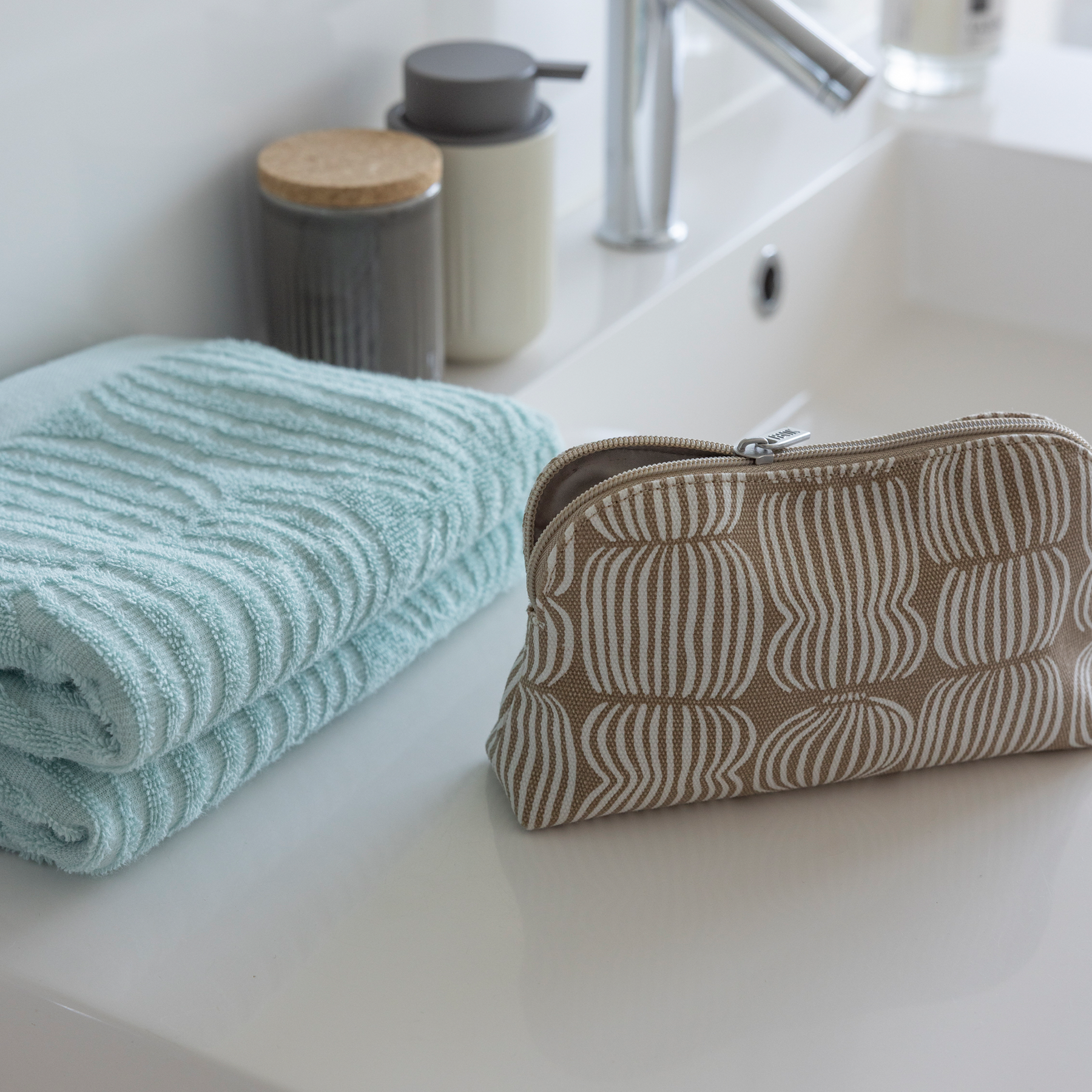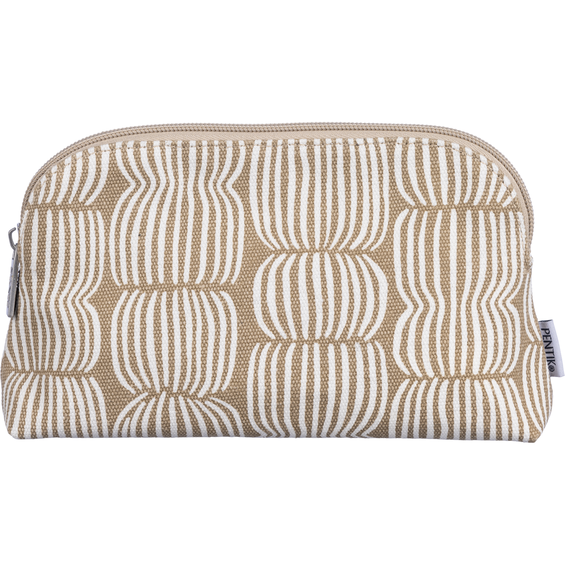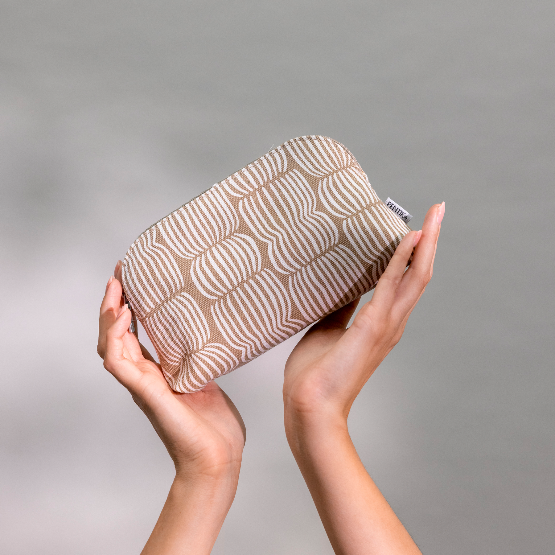 Vetoketjulla suljettava vaaleanruskea Vilja-pussukka on puuvillaa ja kooltaan 5x12x20 cm.