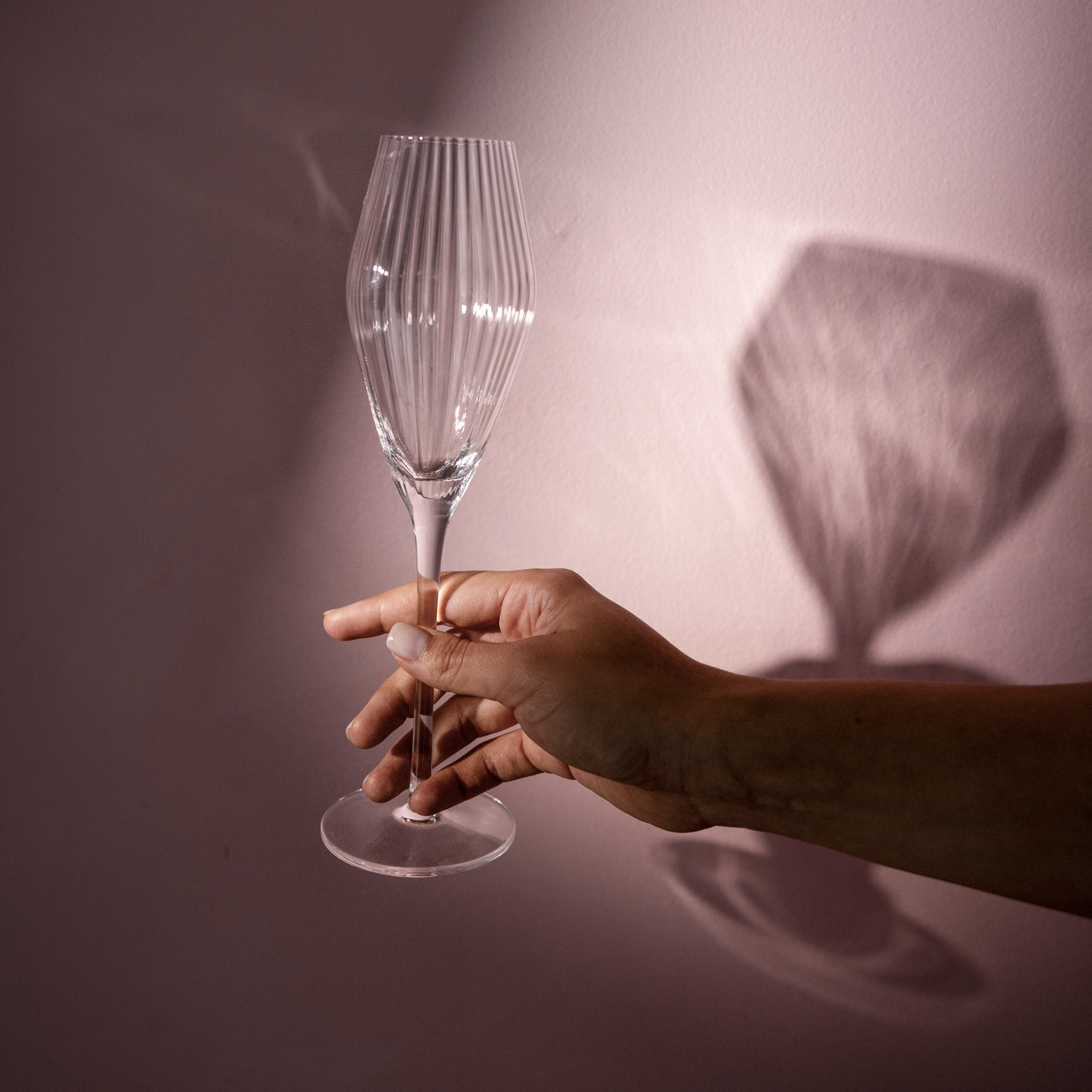 Kevättulvien jälkeen peilikirkas, mutta jäätävän kylmä vesi lipuu ja pyörteilee lähes äänettömästi pohjoisten jokien virtapaikoissa – vuolteissa. Tasaisen tyynesti virtaavaa vettä lumoutuu katselemaan pitkäksi aikaa. Myös Lasse Kovasen suunnitteleman Vuolle-kuohuviinilasin pehmeät, mutta kulmikkaat muodot vangitsevat katseen. Suupuhalletusta lasista valmistettuja kuohuviinilaseja koristavat raidat.